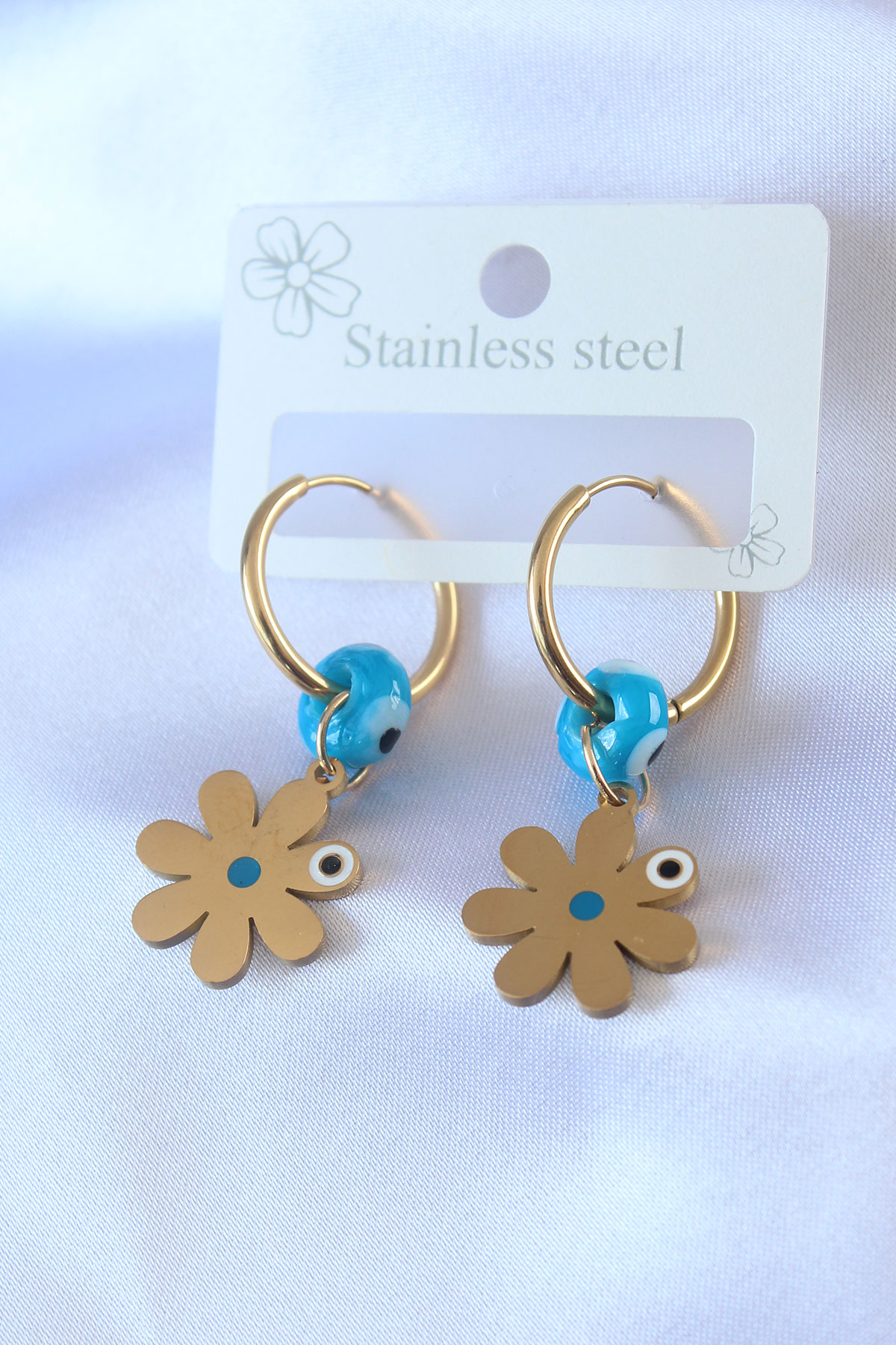 İlk yorum yapan sen ol “316L Çelik Gold Renk Çiçek Model Nazar Boncuk Detay Kadın Küpe”