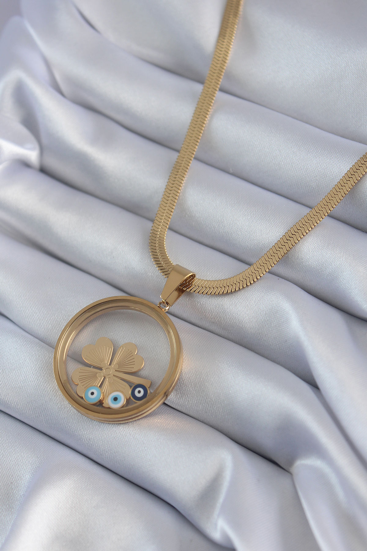 316L Çelik Gold Renk İtalyan Zincir Açılabilir Fanus Yonca Figür Model Kadın Kolye