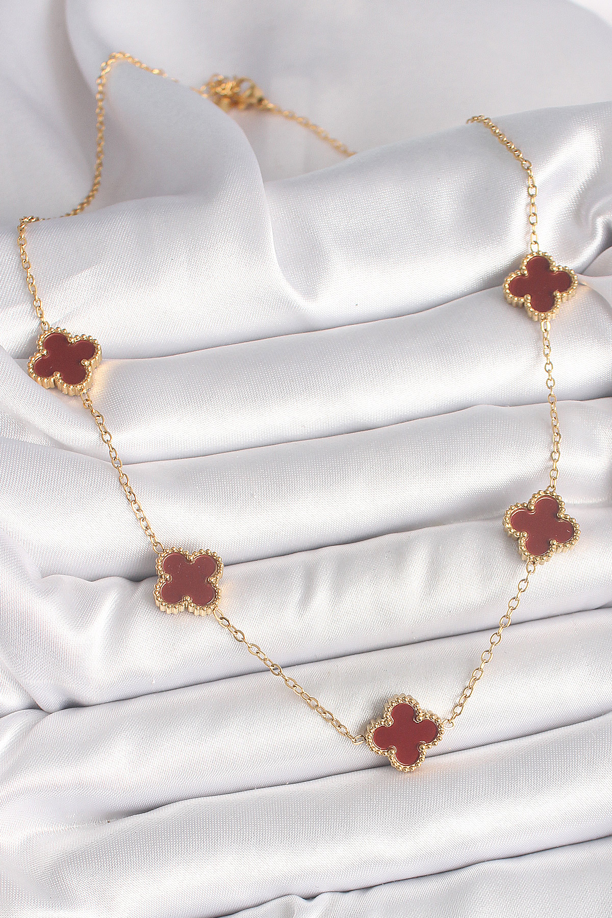 316L Çelik Gold Renk Zincir Bordo Yonca Model Kadın Kolye