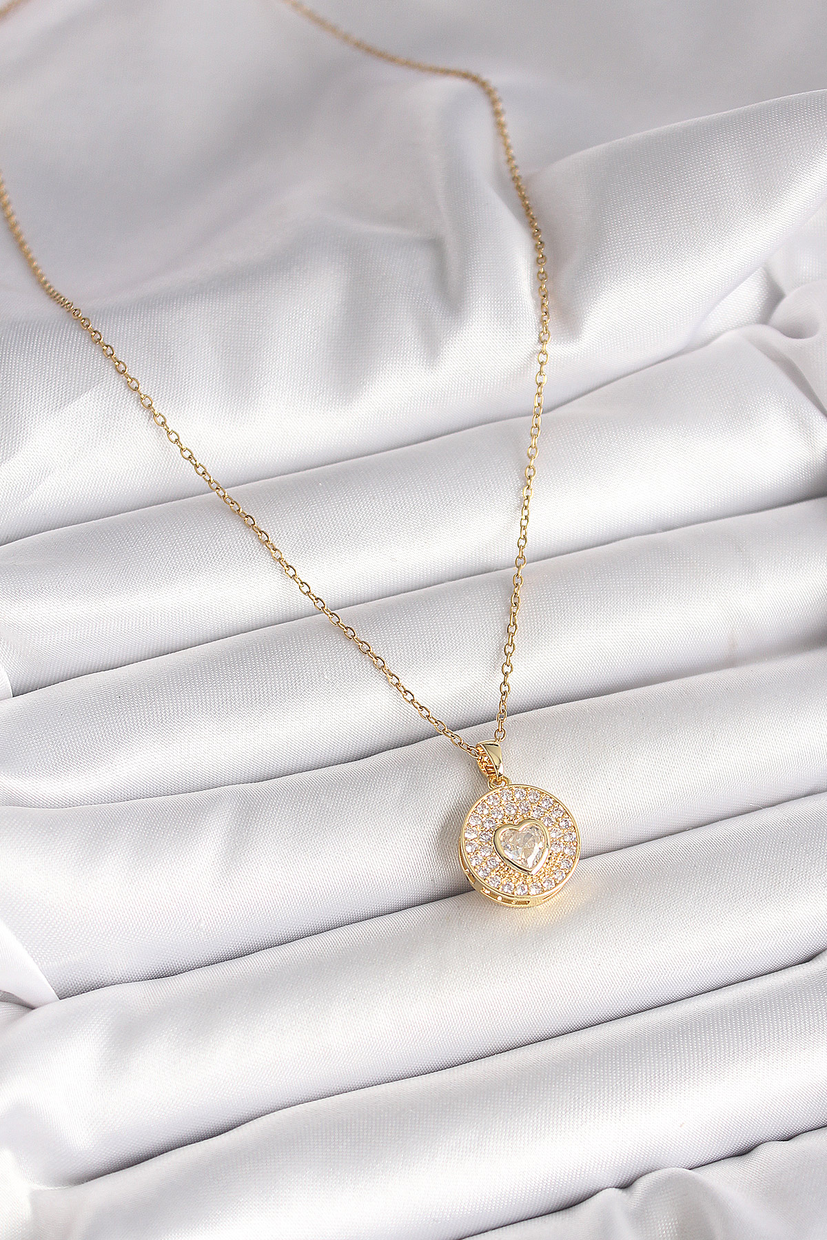 316L Çelik Gold Renk Zincir Madalyon Zirkon Taşlı Kalp Model Kadın Kolye