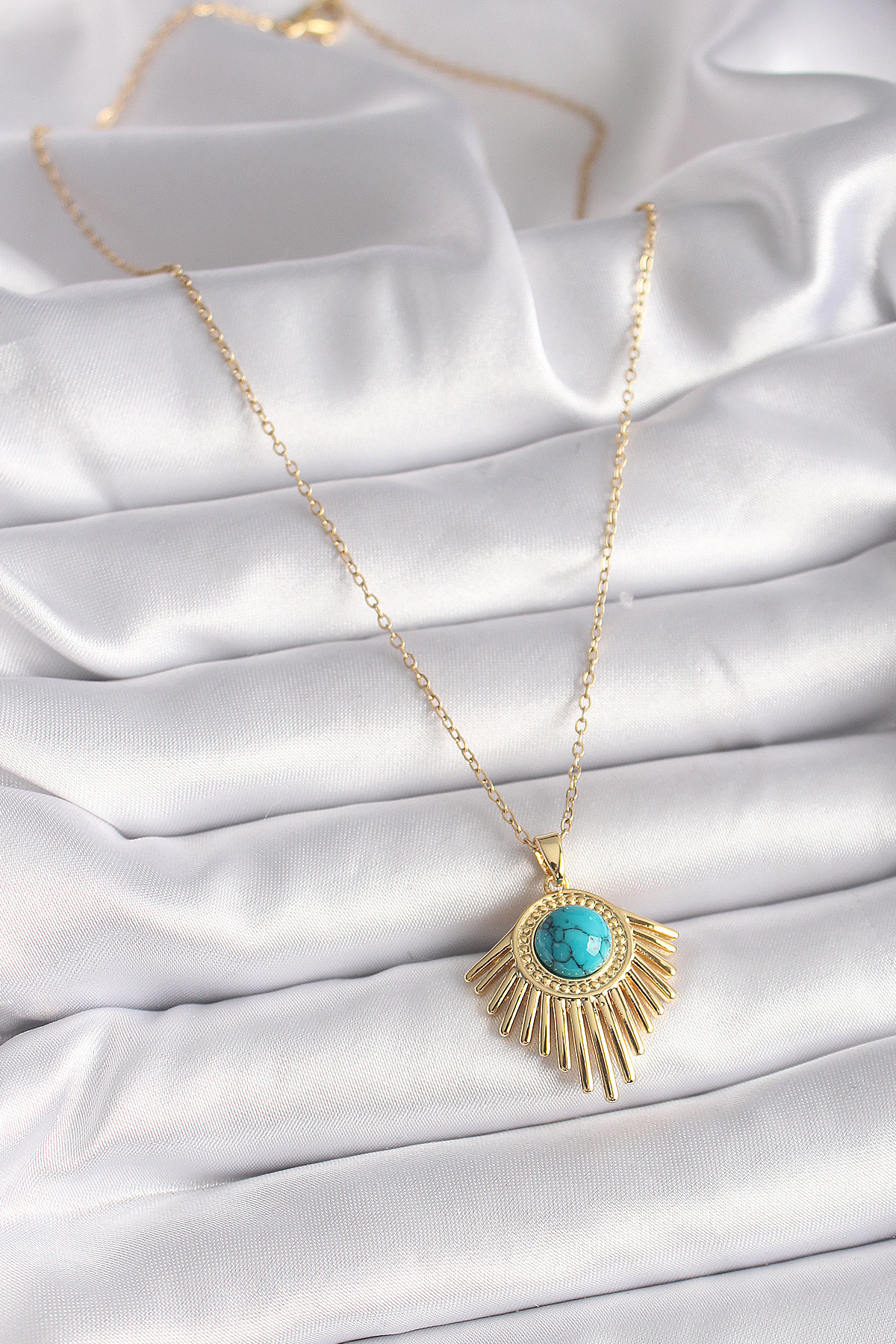 İlk yorum yapan sen ol “316L Çelik Gold Renk Zincir Mavi Boncuk Güneş Model Kadın Kolye”