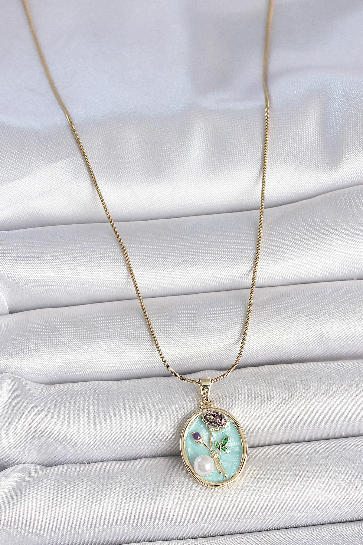 316L Çelik Gold Renk Zincir Mavi Çiçek İşlemeli İnci Detay Portre Model Kadın Kolye