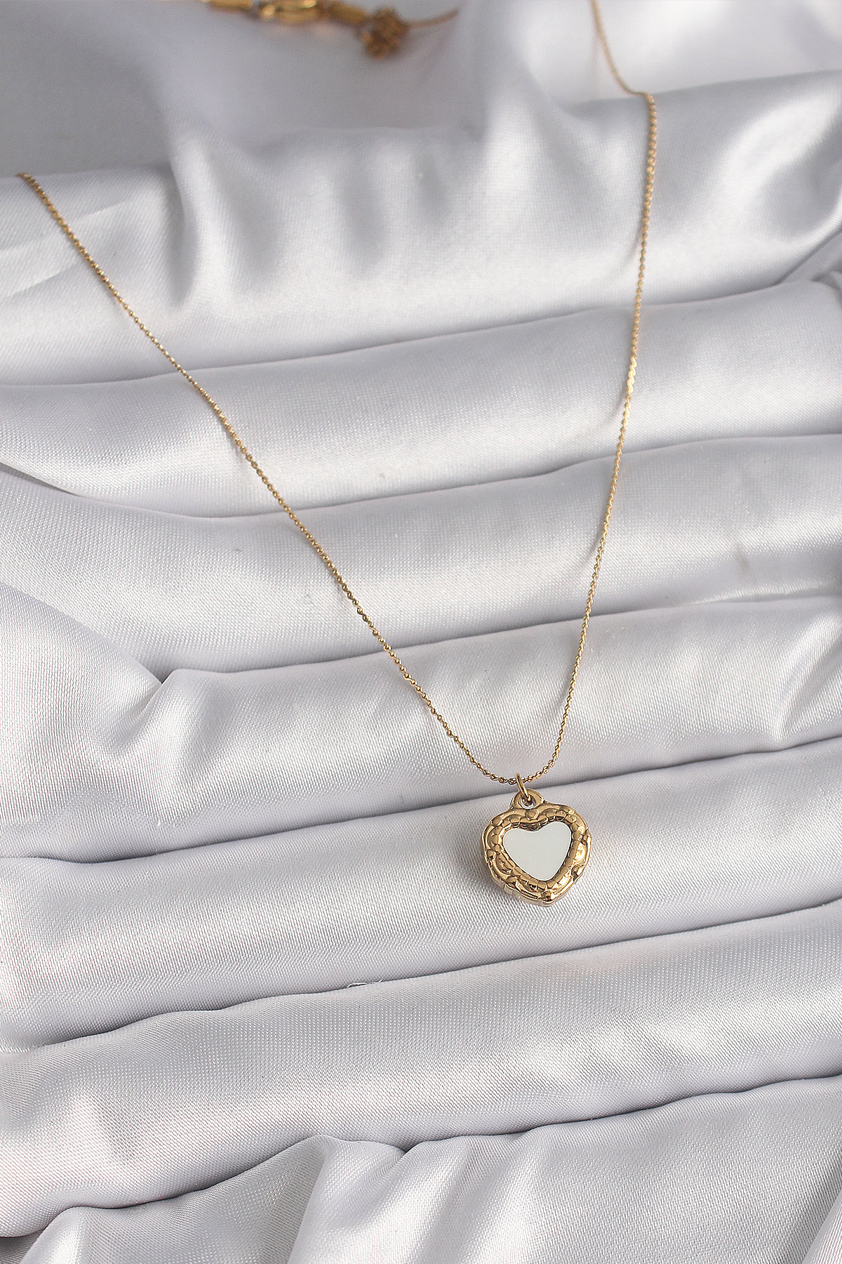 İlk yorum yapan sen ol “316L Çelik Gold Renk Zincir Sedefli Kalp Model Kadın Kolye”