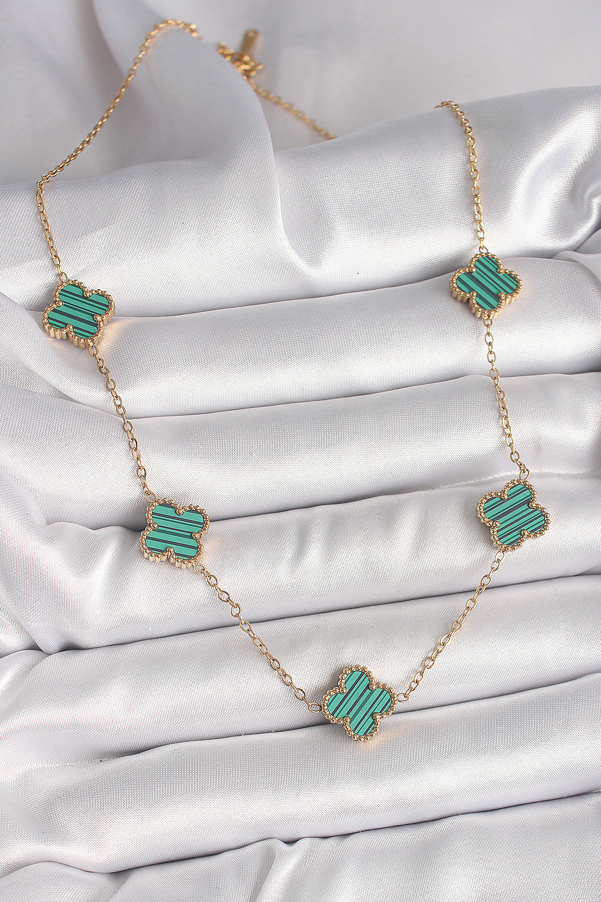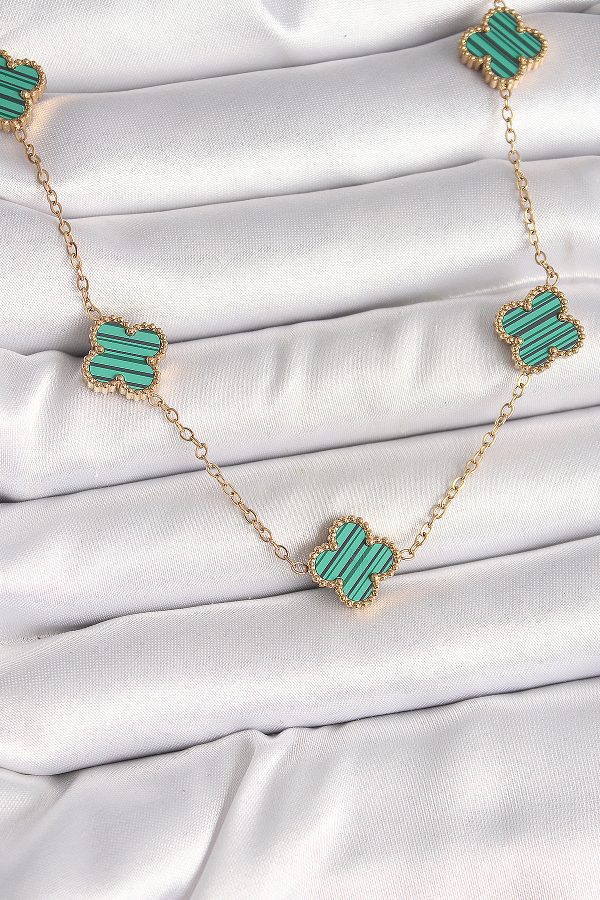 316L Çelik Gold Renk Zincir Yeşil Yonca Model Kadın Kolye