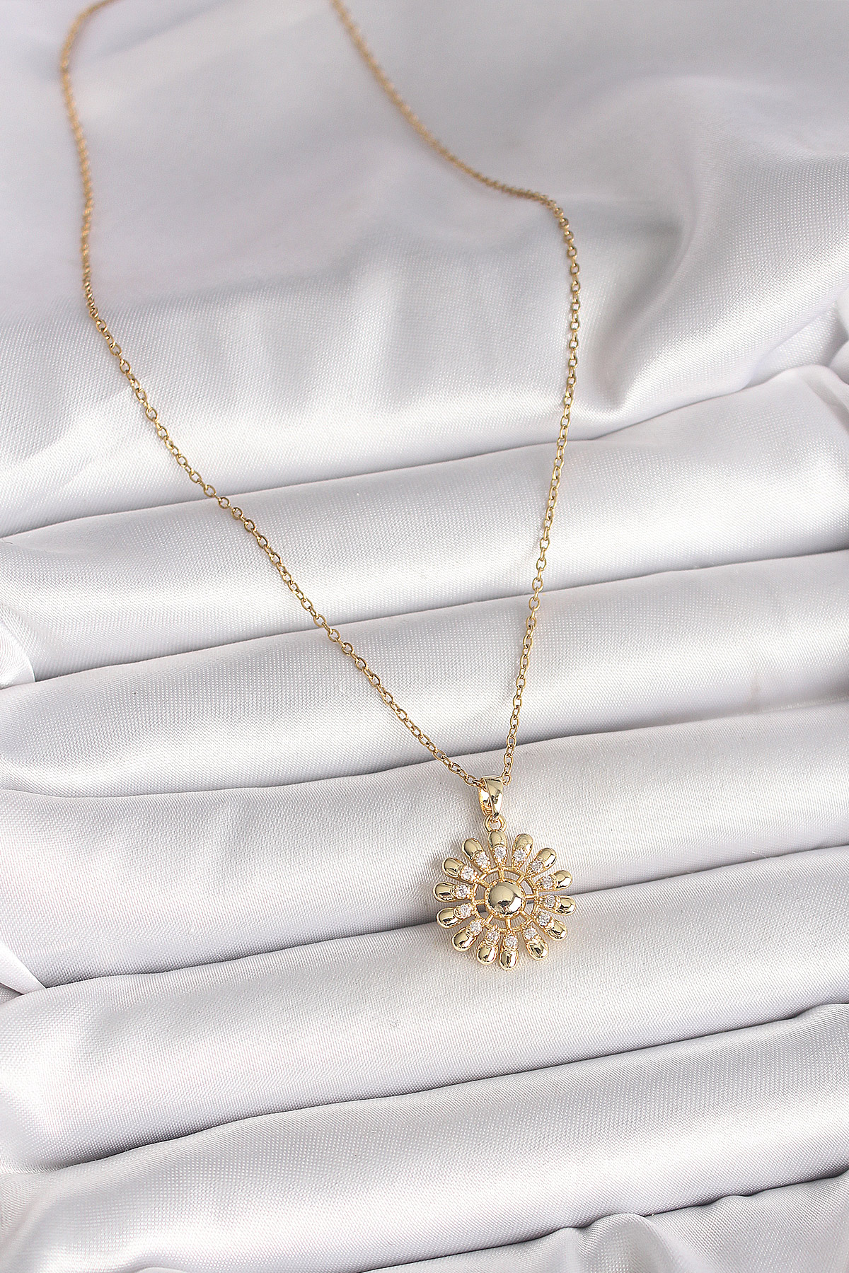 İlk yorum yapan sen ol “316L Çelik Gold Renk Zincir Zirkon Taşlı Güneş Model Kadın Kolye”