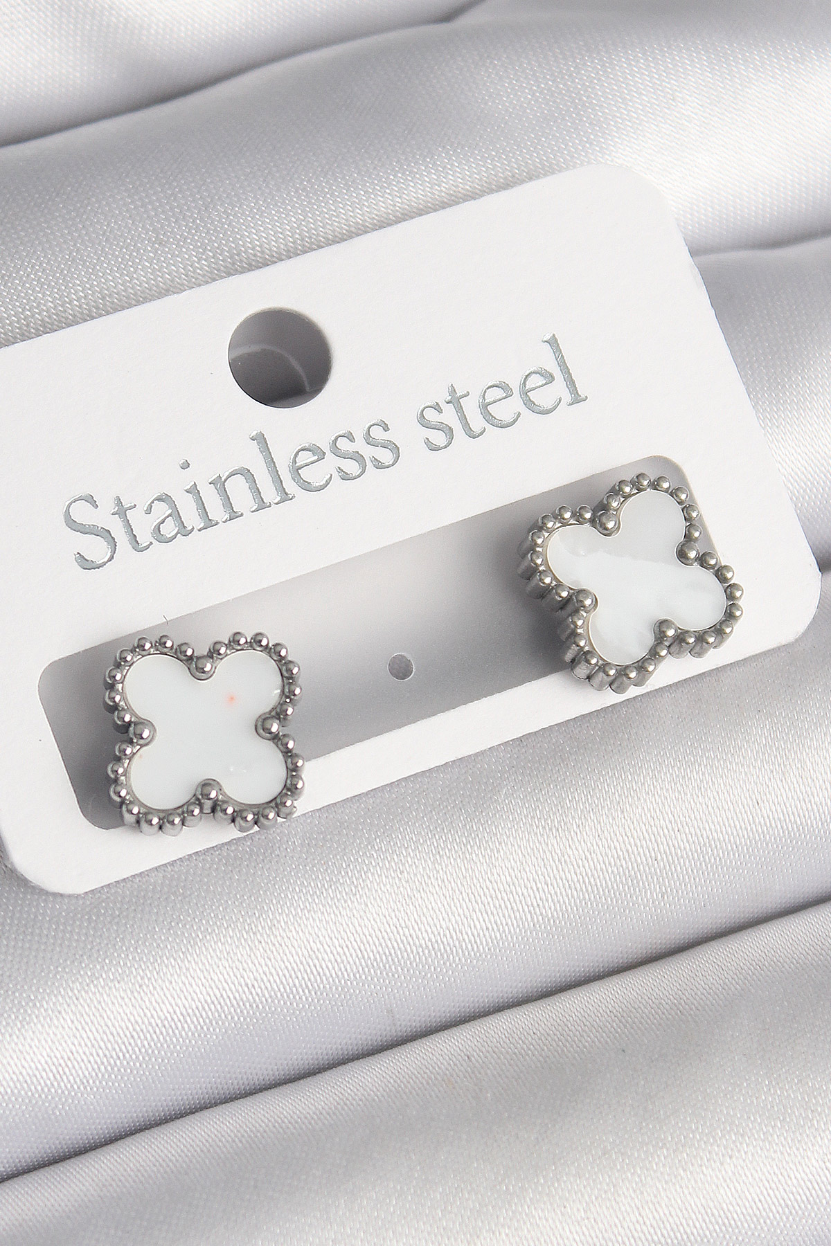 316L Çelik Gümüş Renk Beyaz Yonca Model Kadın Küpe