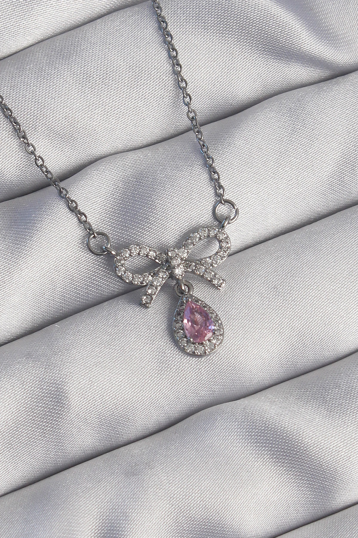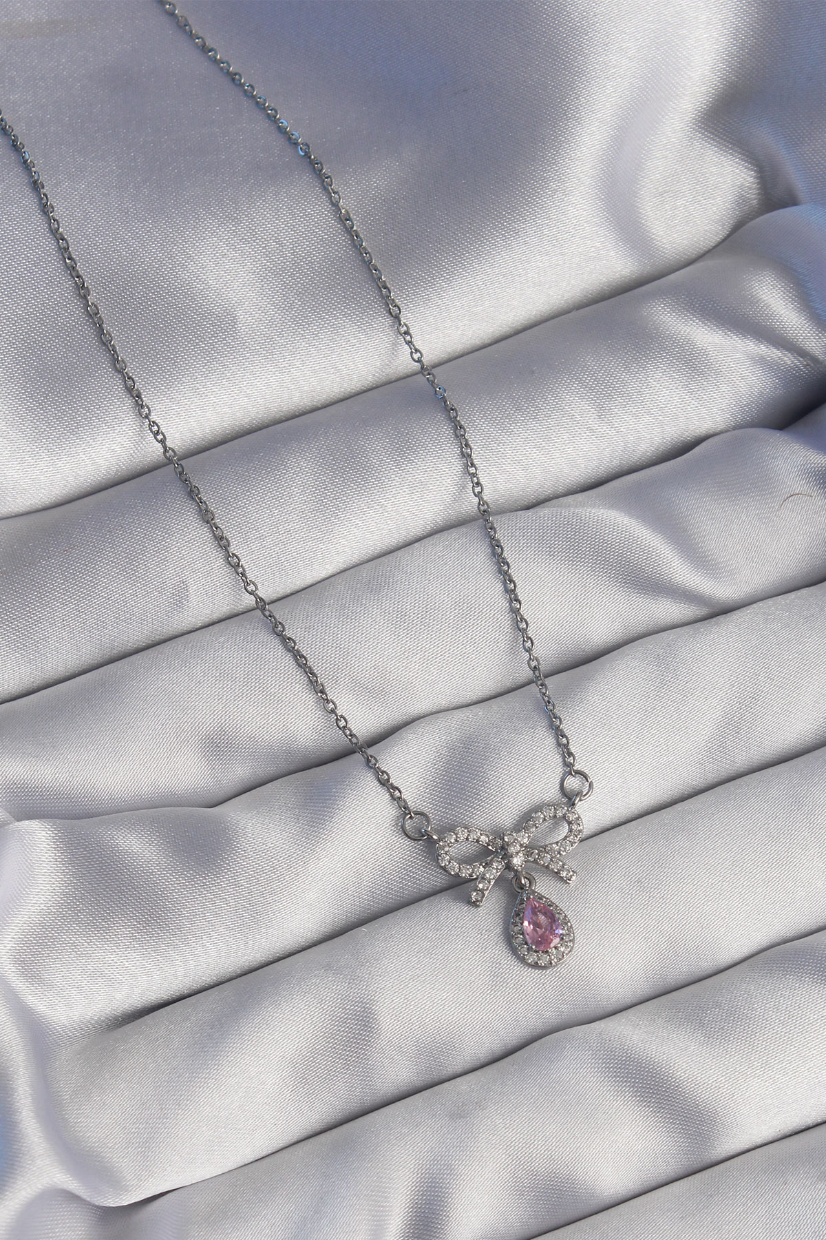 İlk yorum yapan sen ol “316L Çelik Gümüş Renk Fiyonk Detay Pembe Zirkon Taşlı Damla Kolye”