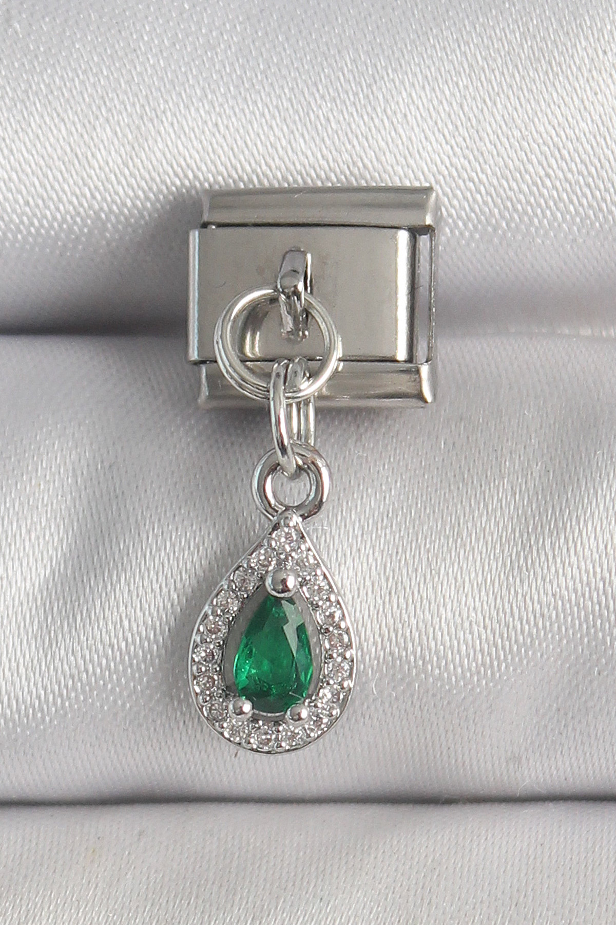 316L Çelik Gümüş Renk Sallantı Yeşil Zirkon Taşlı Damla Model Nomination Charm