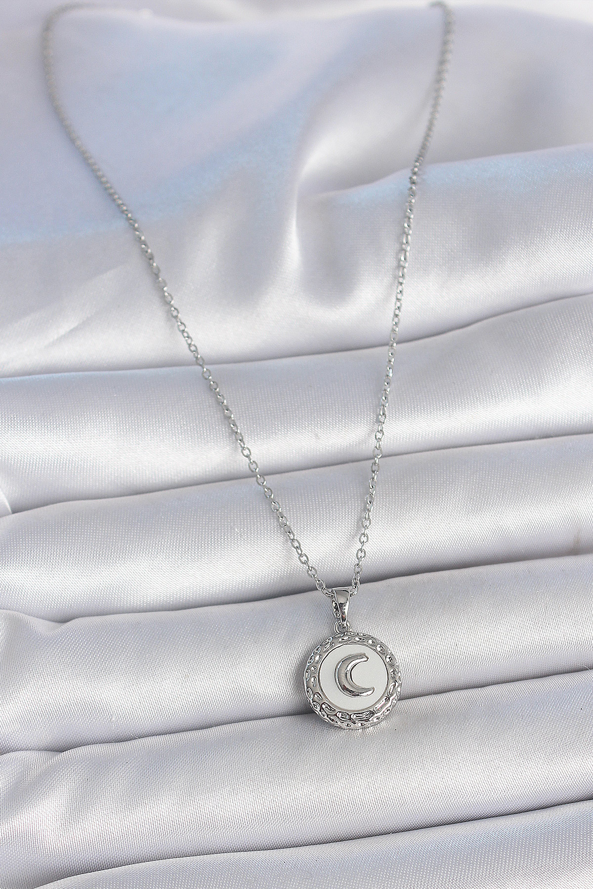 İlk yorum yapan sen ol “316L Çelik Gümüş Renk Zincir Beyaz Mineli Hilal İşlemeli Madalyon Model Kadın Kolye”