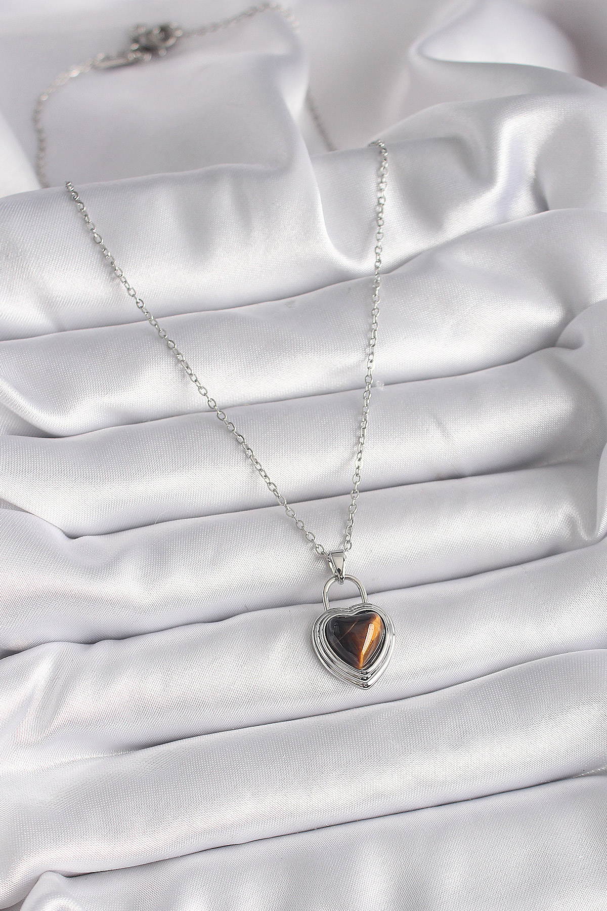 316L Çelik Gümüş Renk Zincir Kilit Kalp Kehribar Boncuk Model Kadın Kolye