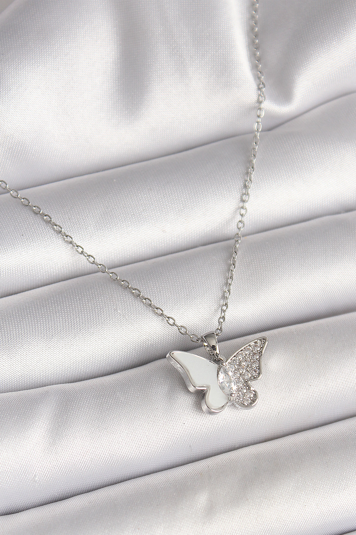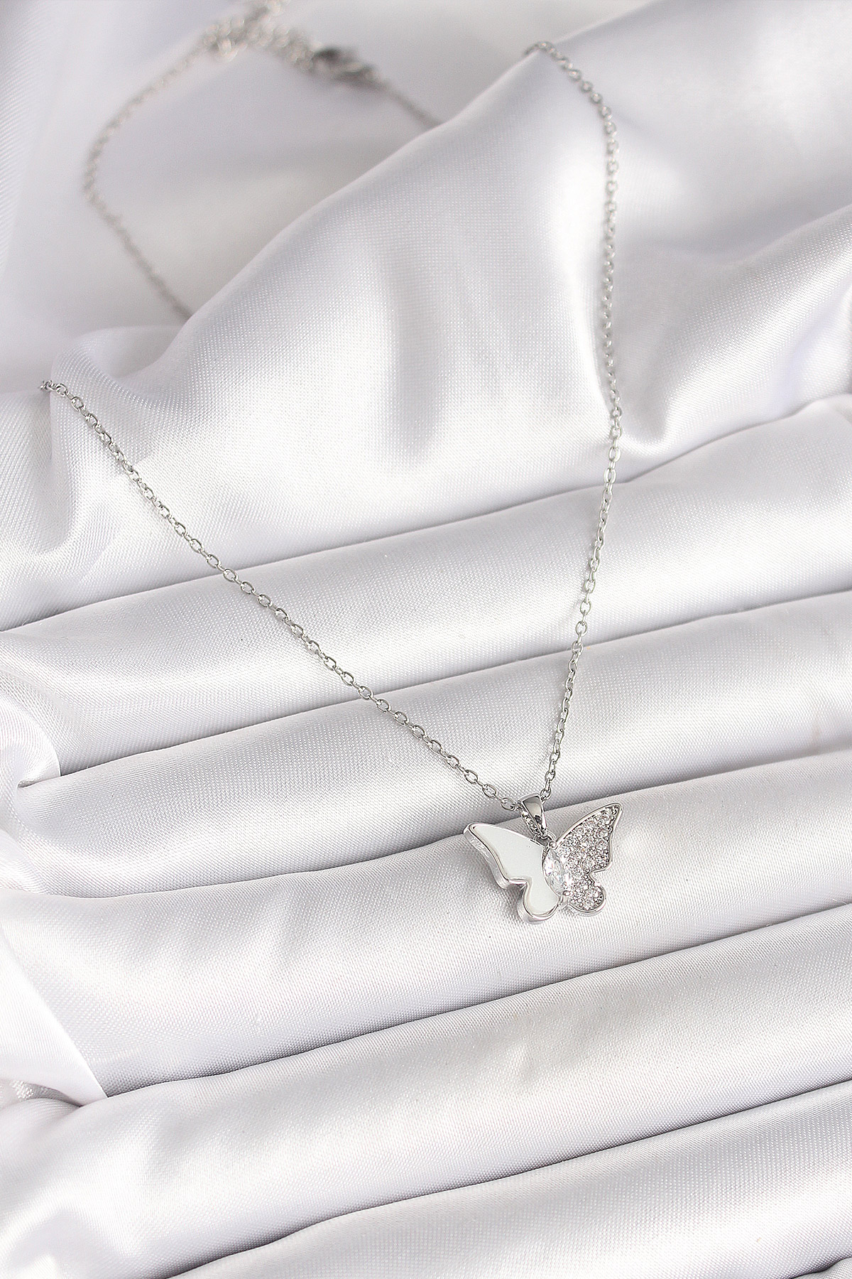 316L Çelik Gümüş Renk Zincir Zirkon Taşlı Beyaz Mineli Kelebek Model Kadın Kolye