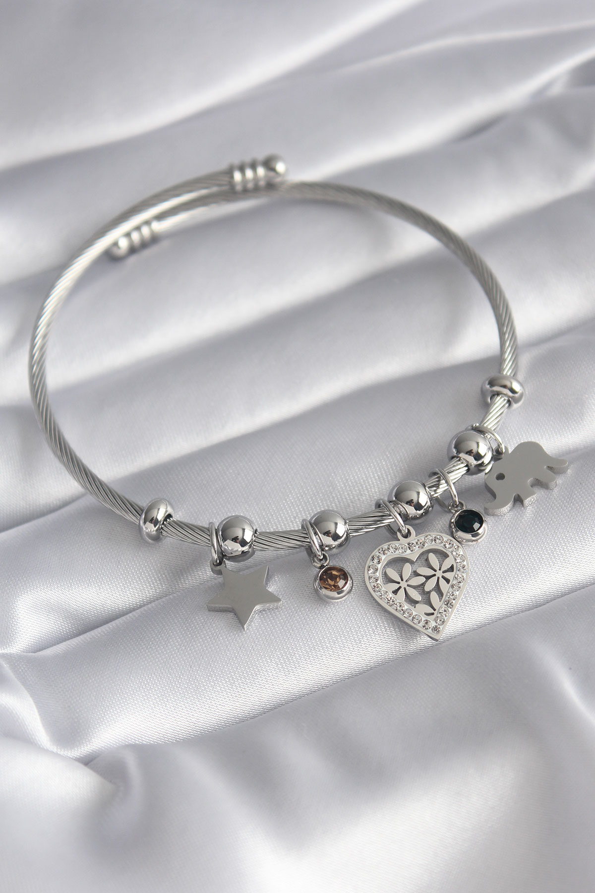316L Çelik Gümüş Renk Zirkon Taşlı Kalp Figür Fil Detay Charm Model Kadın Bileklik