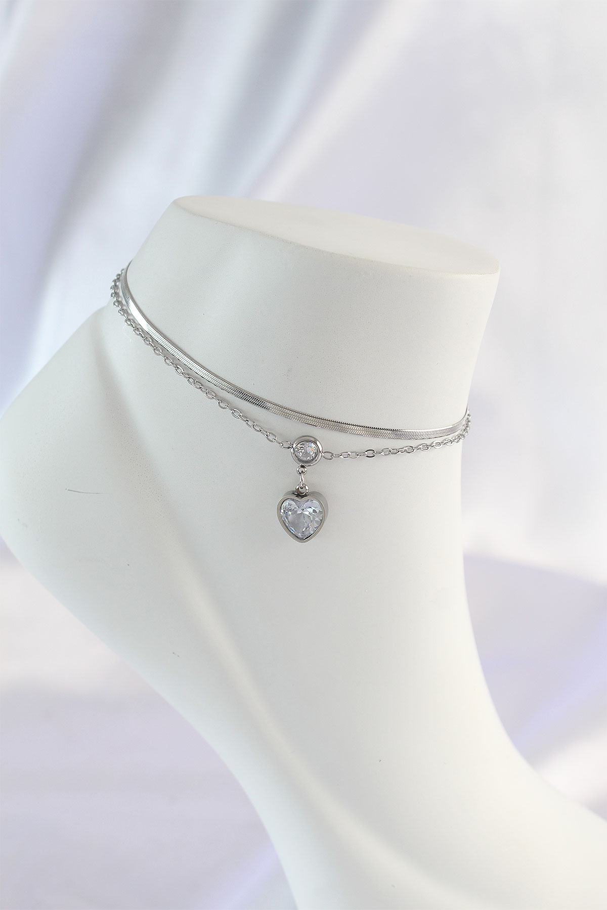 316L Çelik Gümüş Renk Zirkon Taşlı Kalp Tasarımlı 2li Halhal
