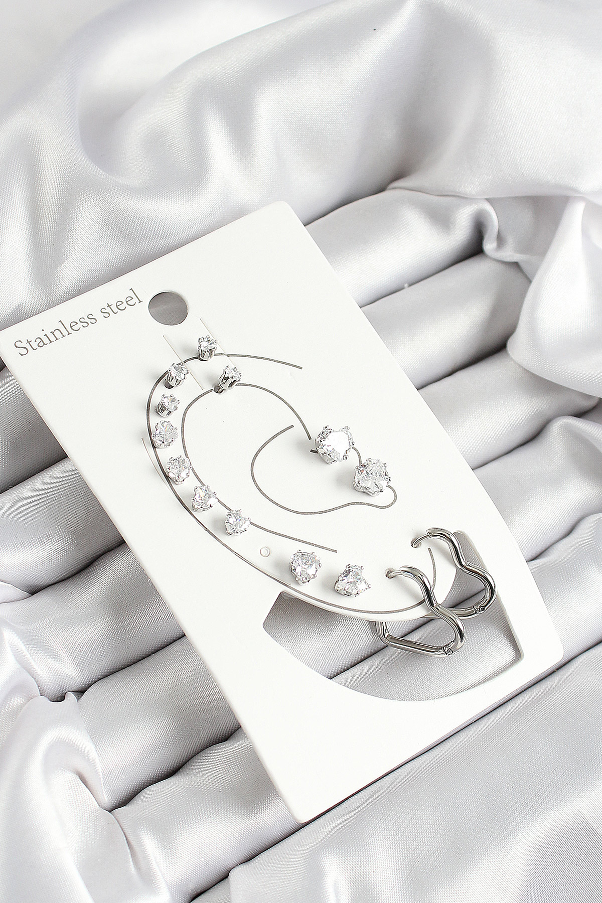 316L Çelik Kalp Figürlü Ve Zirkon Taşlı Gümüş Renk 7’li Çift Kadın Küpe Set