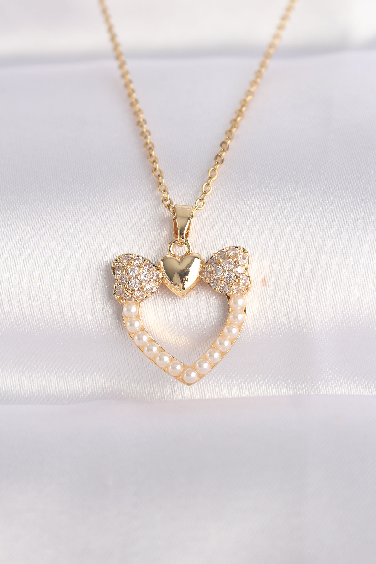 316L Çelik Zincir Altın Renk İnci Taş Detay Zirkon Taşlı Kalp Kolye