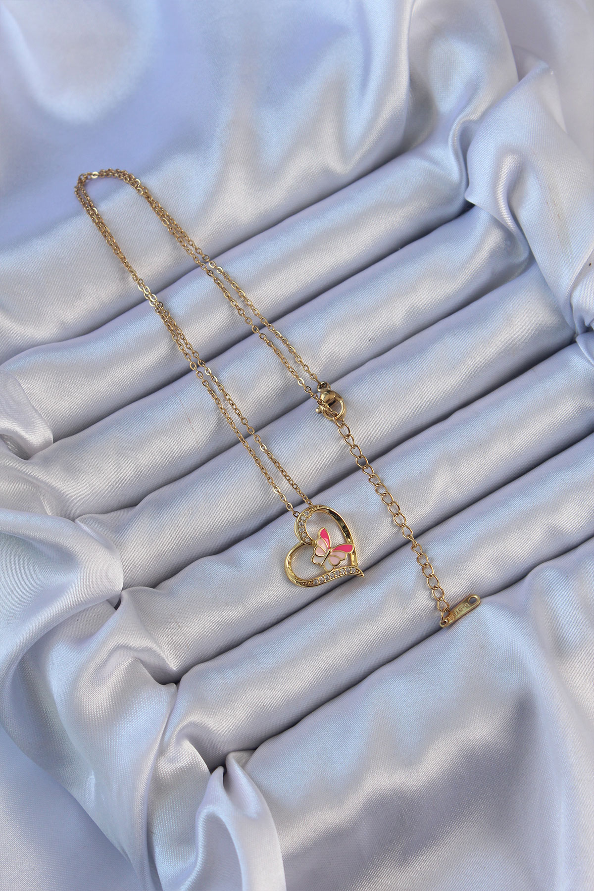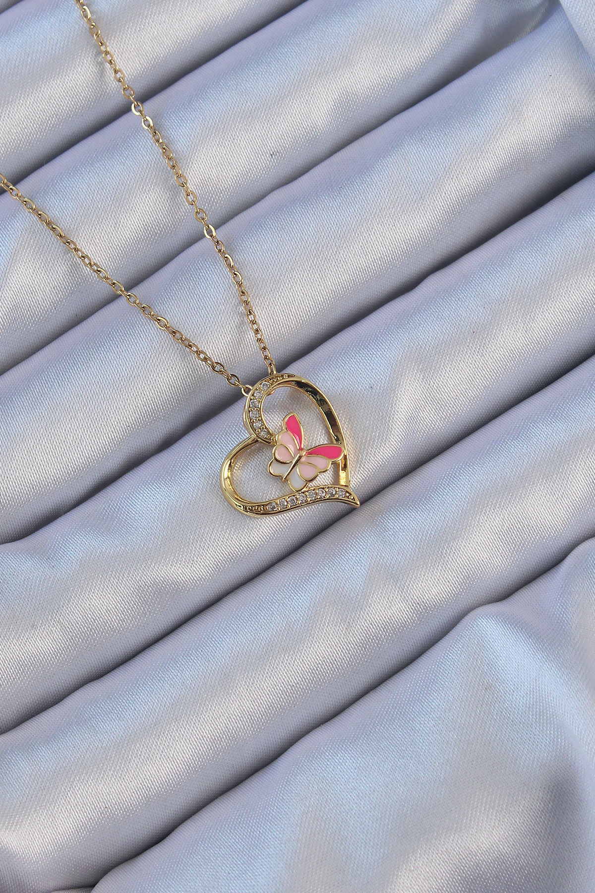 İlk yorum yapan sen ol “316L Çelik Zincir Altın Renk Mineli Kelebek Figür Zirkon Taşlı Kalp Kolye”