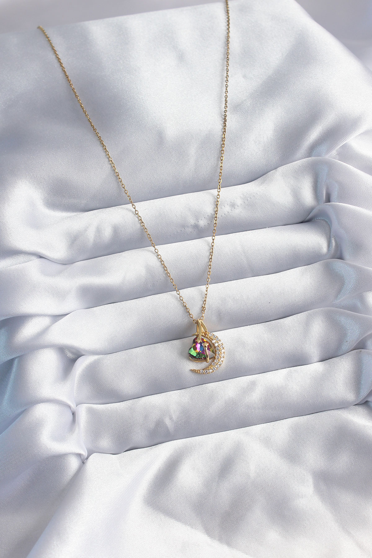 316L Çelik Zincir Gold Renk Zirkon Taşlı Hilal Kristal Kalp Model Kadın Kolye