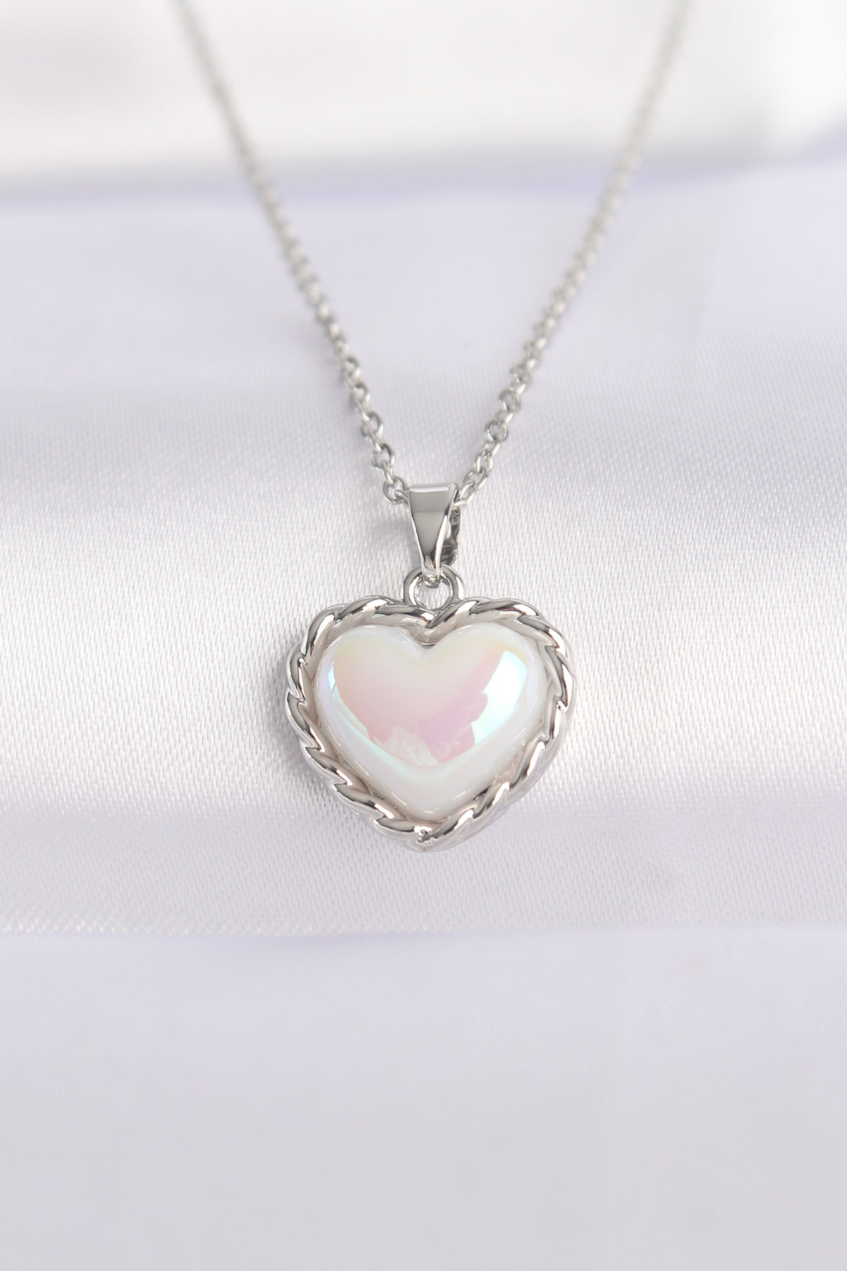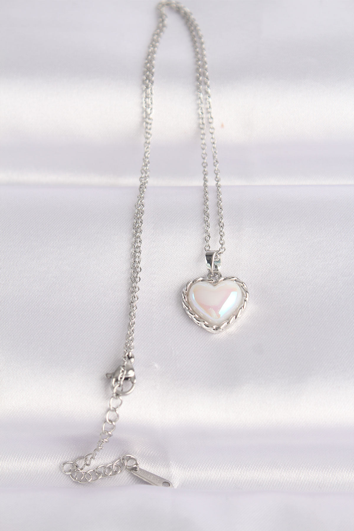 316L Çelik Zincir Gümüş Renk Beyaz Taşlı Bombeli Kalp Kolye