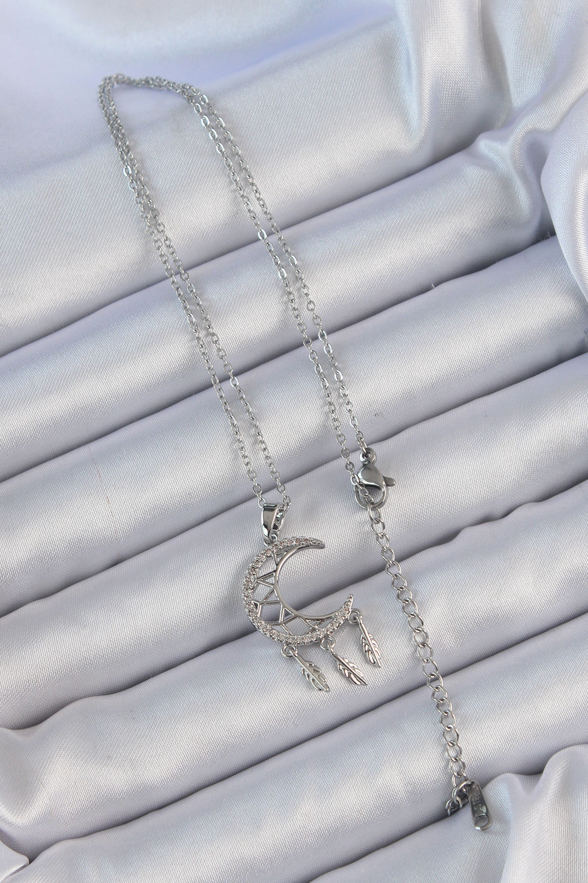 316L Çelik Zincir Gümüş Renk İşlemeli Zirkon Taşlı Ay Kolye