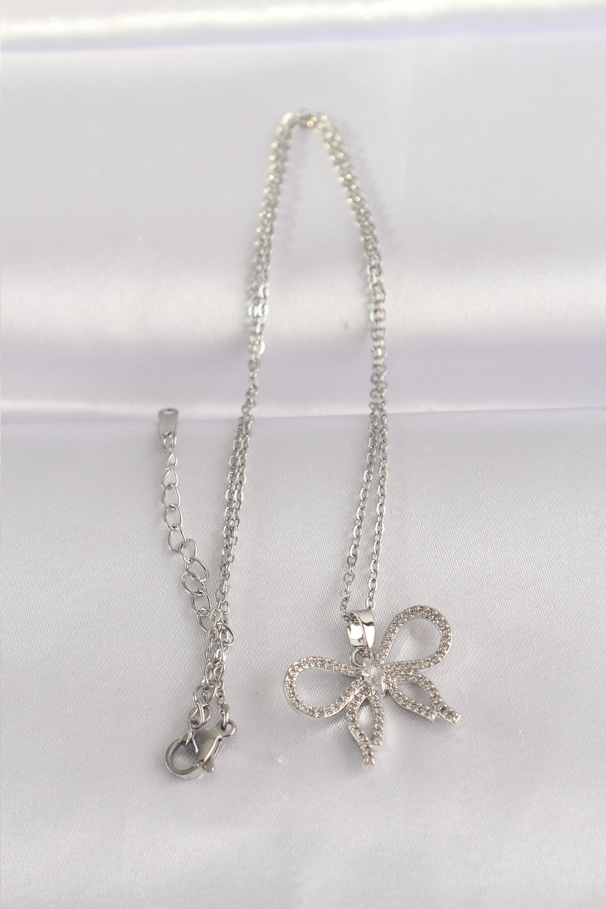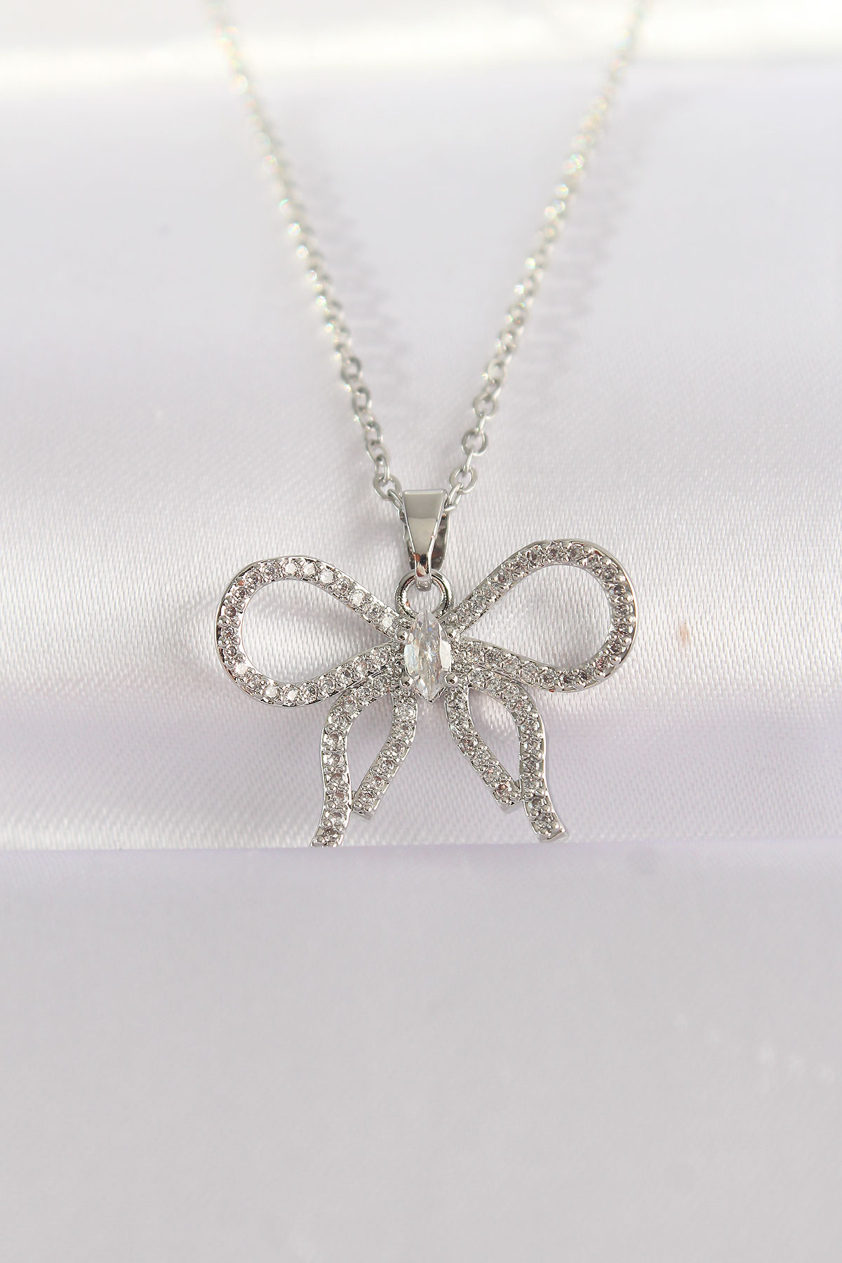 İlk yorum yapan sen ol “316L Çelik Zincir Gümüş Renk Zirkon Taşlı Fiyonk Kolye”