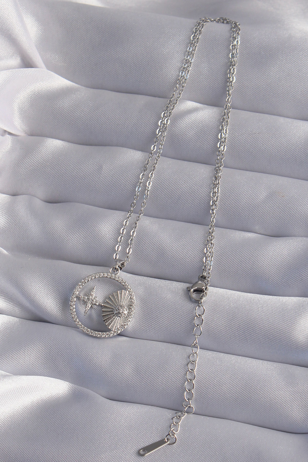 316L Çelik Zincir Gümüş Renk Zirkon Taşlı Yıldız Figürlü Oval Kolye