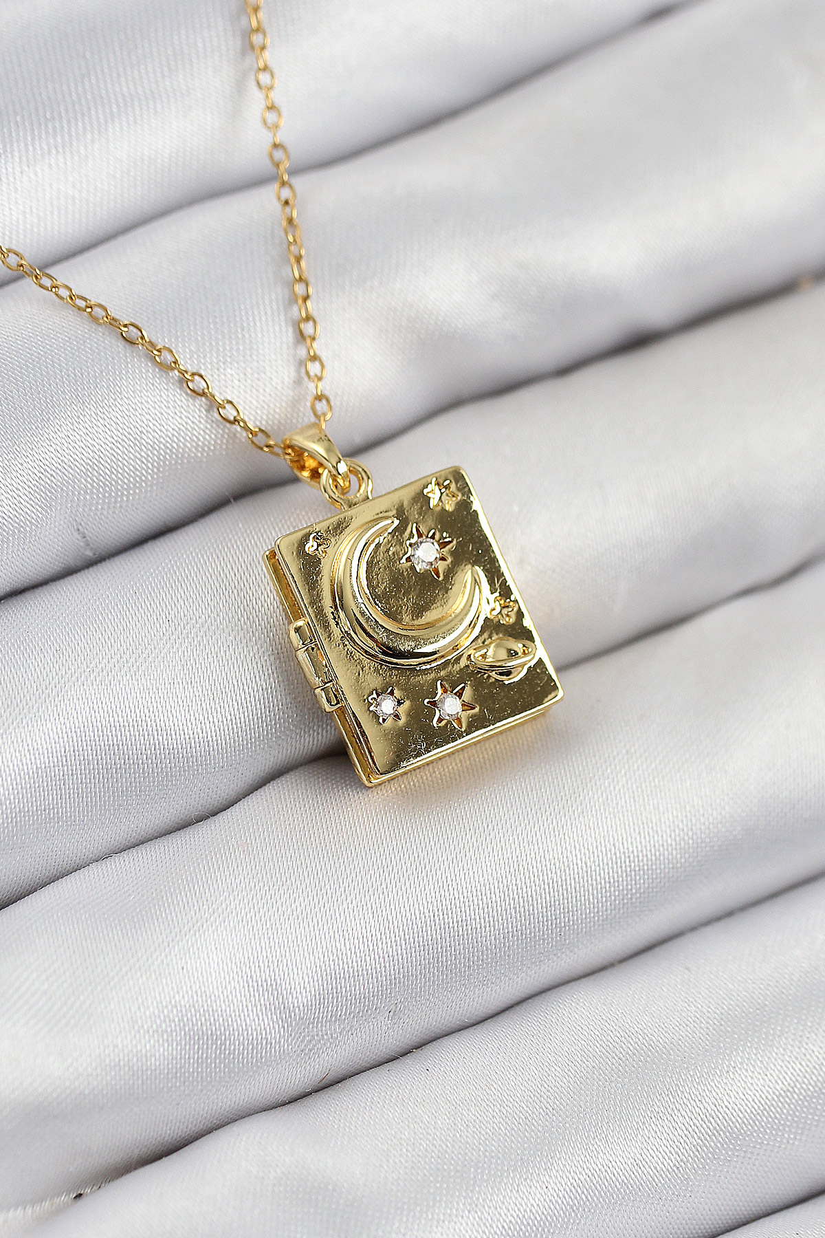 316L Çelik Zirkon Taşlı Açılabilr Kapaklı Kitap Model Gold Renk Kadın Kolye