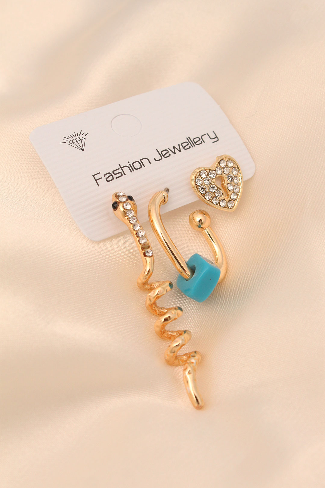 Gold Renk Metal Zirkon Taşlı Yılan ve Kalp Detaylı Küpe Seti