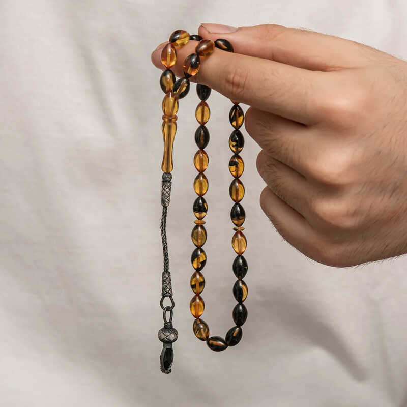 Kehribar, çam ağacı reçinesinin toprak altında uzun yıllar boyunca birikerek oluşan bir maddedir. Hemen hemen taş ile aynı sertliktedir fakat yoğunluğu düşüktür. Çam kokusu yayar. Oluşumu uzun zaman aldığından ve yapay olarak yapılamadığından değerli bir maddedir. Sıkma kehribar ise kehribar taşından farklı olarak onun özelliklerini taşıyan, görüntü itibariyle ona benzeyen fakat gerçek olmayan bir malzemedir. Ülkemizde ve dünyanın bir çok yerinde kehribar taşından çeşitli malzemeler üretilmiştir. Ülkemizde en yaygın olarak tesbih üretilmektedir. Kehribar tesbihler elde ısındıkça kehribar benzeri bir koku verir ve renk değiştirir. Bir çok rengi vardır. Hatta iki rengin birleşiminden oluşan kehribar tesbih modelleri de vardır. Genellikle gümüş püskül ile kullanılır veya sistemli olarak da kullanılabilir. Ülkemizin güzide tesbih ustaları bu malzemeyi sıklıkla işlemek suretiyle çeşitli sanat eserleri meydana getirirler. Bu tesbihler de koleksiyonerler tarafından alınıp satılmaktadır. Gümüş 1000 ayar kazaz püsküllü sıkma kehribar tesbih modeli de günlük hayatta kullanılabilecek çok şık bir tesbih çeşididir. Özel günlerin vazgeçilmez hediyesi sıkma kehribar tesbihler erkekler için doğum günü, sevgililer günü ve babalar günü gibi özel zamanlarda hediye olarak tercih edilebilir. Gümüş kazaz püsküllü sıkma kehribar tesbih modeli diğer kehribar tesbih modellerinde olduğu gibi tamamen el emeği ile imal edilmiştir.