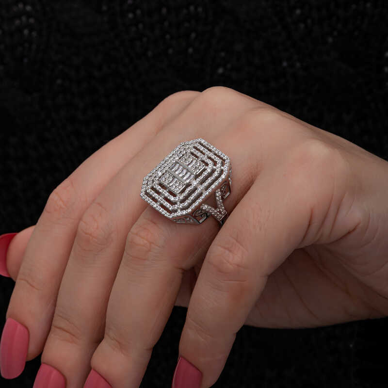 Gümüş Baget Taşlı Kadın Yüzük Zirkon Taşlı Yüzükler Gümüş Baget Taşlı Kadın YüzükIşıl ışıl baget ve zirkon taşlarla süslenmiş bu şık yüzük modeli; doğum günü hediyesi, sevgililer günü hediyesi veya an