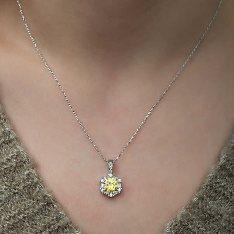 İlk yorum yapan sen ol “​Gümüş Buğday Sarısı Baget Taşlı Bayan Kolye”