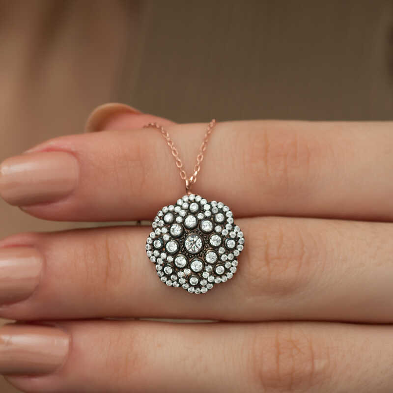Gümüş Çiçek Desenli Elmas Montür Kolye