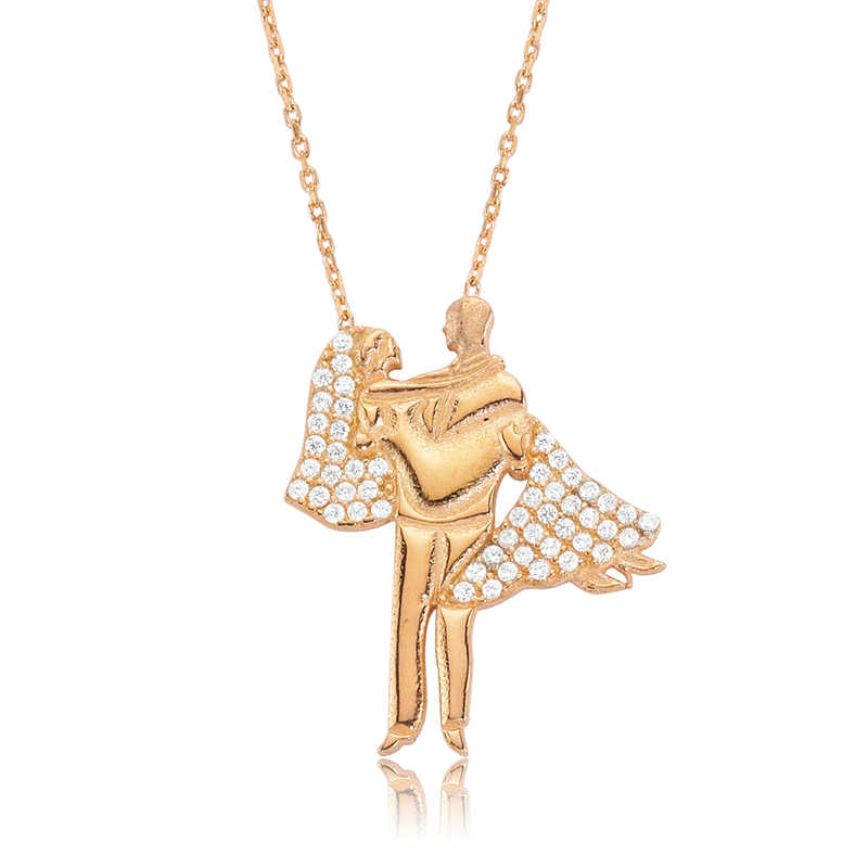 Eşinize duyduğunuz aşkınızı ve ilk anki mutluluğunuzu her an hatırlayabileceğiniz, en romantik anlarınıza eşlik edecek gümüş evlilik bayan kolye mutlu çiftleri bekliyor. Bu özel tasarım bayan kolye modeli 925 ayar gümüşten imal edilmiştir. Gümüş üzerine altın kaplama yapılmıştır. Altın kaplama yapılan gümüş bayan evlilik kolye modelleri parlaklığını uzun süre muhafaza eder ve oksitlenmesi gecikir. Gümüş olan zincir boyu ortalama 45 cm’dir. Tüm gümüş bayan kolye modellerinde olduğu gibi gümüş evlilik bayan kolye modeli de el emeği ile üretilmiştir. Gümüş ve değerli taşlar nedeniyle belirtilen ürün ağırlığında ± %10 sapma olabilmektedir.