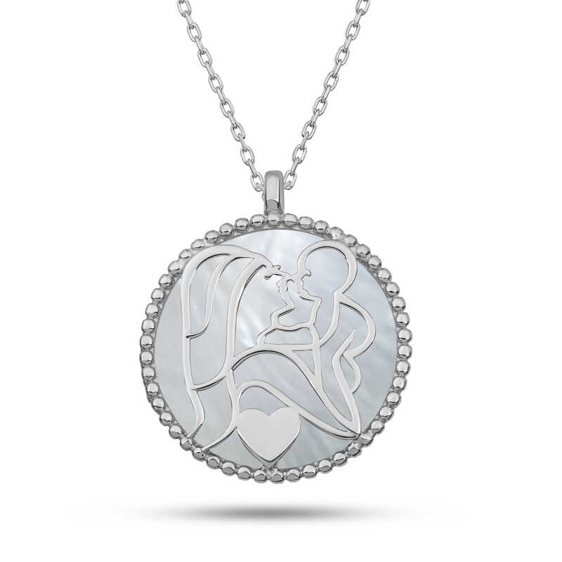 Sevgi ve bağlılığın simgesi olan bu şık kolye,anne ve çocuk arasındaki özel bağı yansıtır.Parlak gümüş tonuyla tasarlanmış olan bu benzersiz tasarım,fosfor özelliği sayesinde karanlıkta yumuşak bir ış
