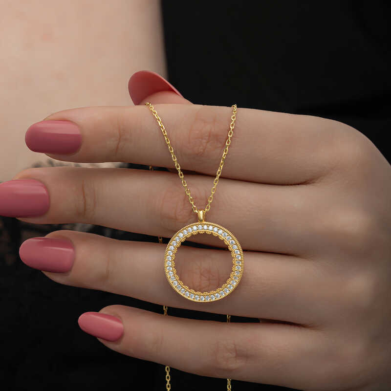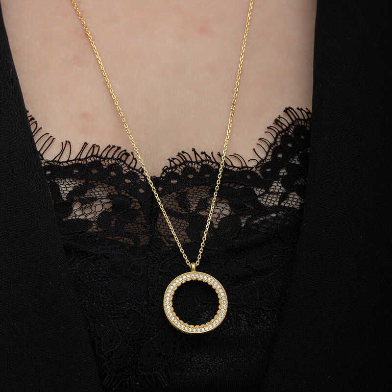 Gümüş Gold Kaplama Yuvarlak Çeyrek Altın Takılabilen Kadın Kolye Zirkon Taşlı Kolyeler Gümüş Gold Kaplama Yuvarlak Çeyrek Altın Takılabilen Kadın KolyeYuvarlak form deseniyle şıklığı ifade eden gümüş