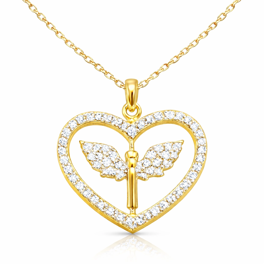 Zirkon taşlarla süslenmiş kalp formu içinde Mikail Meleği figürü bulunan, şık ve anlamlı 925 ayar gümüş kadın kolye.
