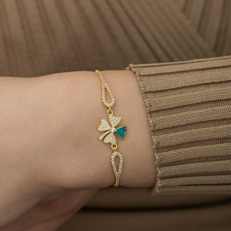 Gümüş Gold Nazarlı Yonca Bileklik Çiçek Bileklikler Gümüş Gold Nazarlı Yonca BileklikDört yapraklı yonca bütün kültürlerde iyi şansın sembolü olarak kabul edilir. Yoncanın dört yaprağının da ayrı bir