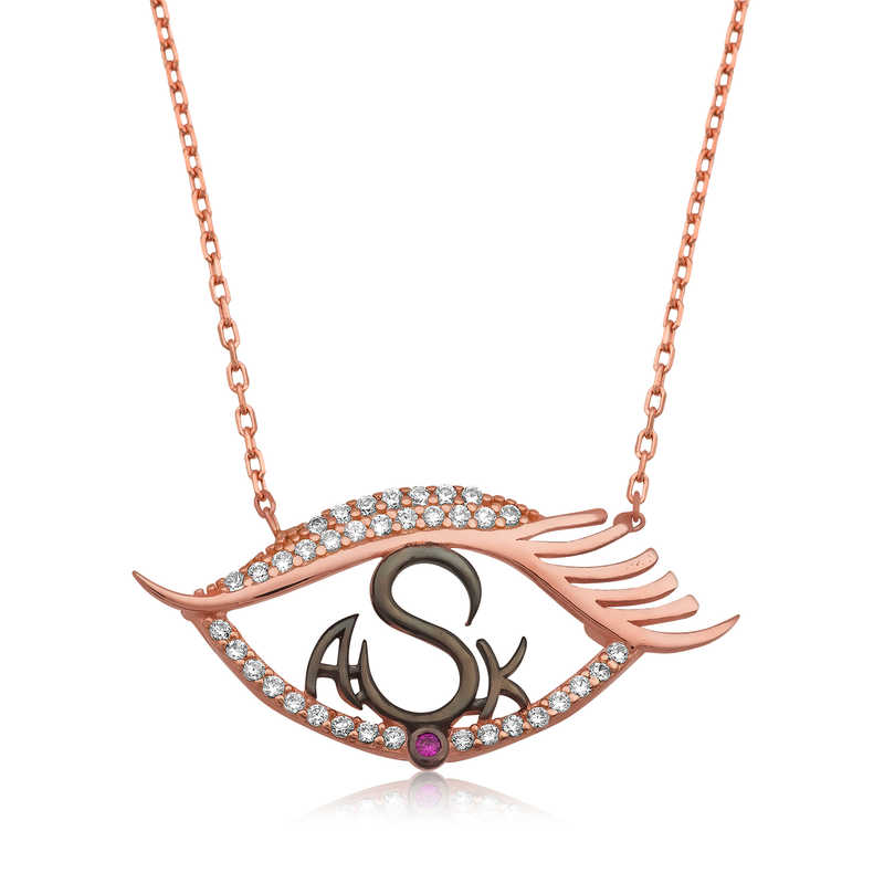 Sevgilinize aşkınızı ifade etmenin en güzel, en anlamlı yollarından biri de, onun sizin gözünüzden nasıl göründüğünü anlatan kolyedir. Sevgilinize hediye edeceğiniz bu özel göz içerinde Aşk yazılı kolye ile ona olan aşkınızı ifade edebiliriniz. Bu şık kolye modeli 925 ayar gümüşten imal edilmiştir. Gümüş üzerine rose altın kaplama yapılmıştır. Rose altın kaplama yapılan gümüş bayan kolye modelleri parlaklığını uzun süre muhafaza eder. Ürünlerimizin tamamı el emeği ile üretilmiştir. Gümüş ve değerli taşlar nedeniyle belirtilen ortalama ürün ağırlığında ± %10 sapma olabilmektedir.