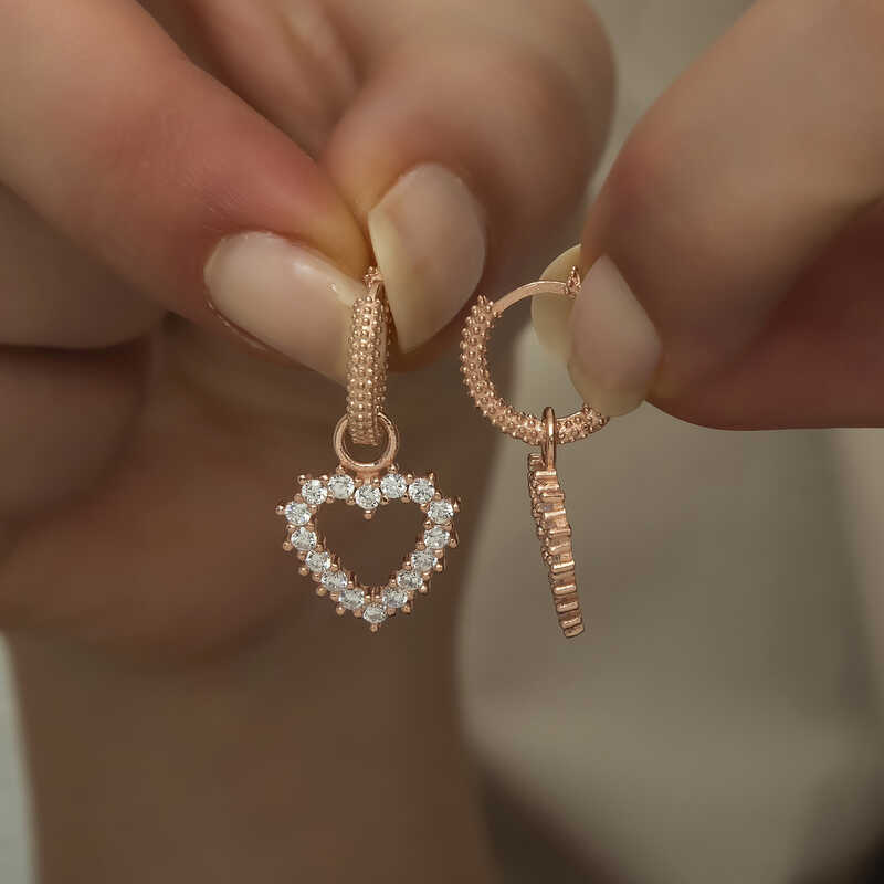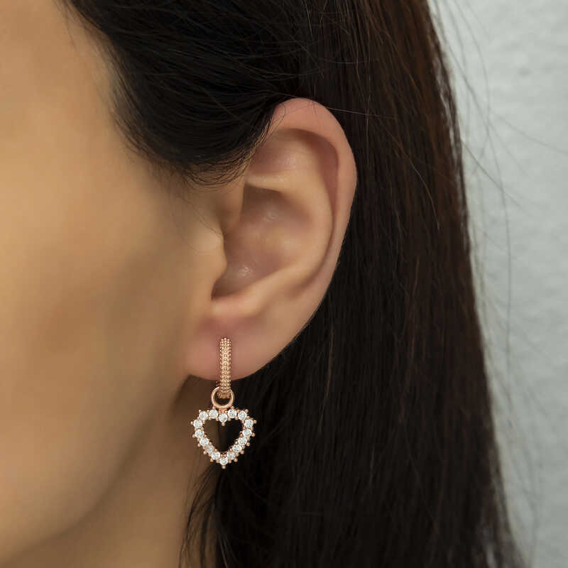 Kalp deseninin hepsi taşlı olan bu harika tasarım kalp küpe modeli 925 ayar gümüşten imal edilmiştir. Kalp tasarımlı küpeler aşkı çağrıştırır. Bu yüzden gümüş küpe güzel bir hediye seçeneği de olabilir. Bu küpe üzerinde zirkon taşlar kullanılmıştır. Gümüşün üzerine oksitlenmesinin gecikmesi ve parlaklığını uzun süre muhafaza etmesi için rose kaplama yapılmıştır. Bu bayan kalp küpe modeli diğer gümüş bayan kalp küpe modellerinde olduğu gibi el emeği ile üretilmiştir. Gümüş ve değerli taşlar nedeniyle belirtilen ortalama ürün ağırlığında ± %10 sapma olabilmektedir.
