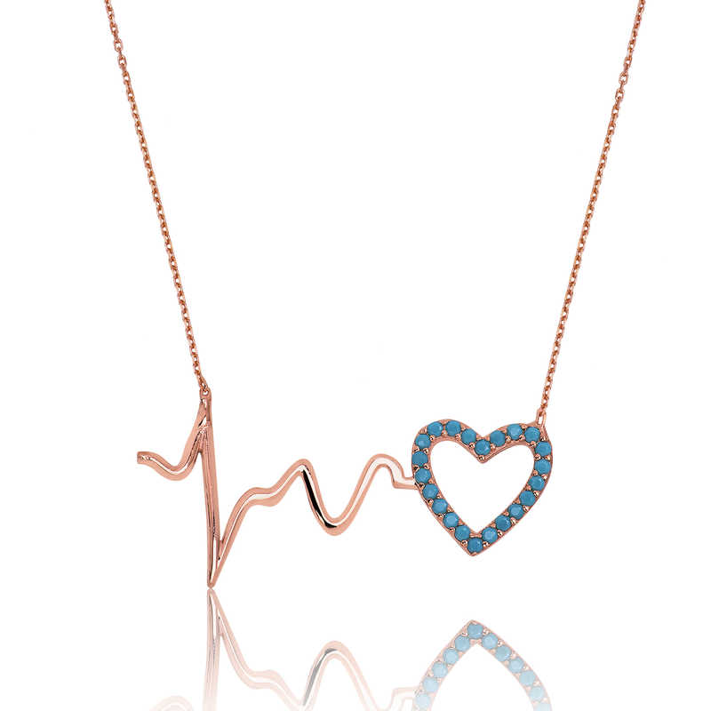 Kalbinizin ritmi aşka atıyorsa, yaşama aşkla bağlıysanız sizi en iyi ifade edecek modellerden biri olan Kalp Ritmi Kolye tam size göre. Hayatta bazı şeyler kalbimizin çok daha hızlı atmasını sağlar. Aşk gibi kalbin hızlı atmasını sağlayan tutkuyla bağlı olduğumuz şeyler insanları temsil etmektedir. Bu nedenle gümüş kalp ritmi kolye hem kendinize alabileceğiniz hem de sevdiklerinize hediye edebileceğiniz bir seçenektir. Gümüş üzerine rose altın kaplama yapılmıştır. Rose altın kaplama yapılan gümüş bayan kolye modelleri parlaklığını uzun süre muhafaza eder ve gümüşe pembe rengi verir. Üzerinde bulunan taşlar zirkondur. Gümüş zincir uzunluğu ortalama 45 cm’dir. Tüm gümüş bayan kolye modellerinde olduğu gibi gümüş kalp ritmi bayan kolye de el emeği ile üretilmiştir. Gümüş ve değerli taşlar nedeniyle belirtilen ürün ağırlığında ± %10 sapma olabilmektedir.