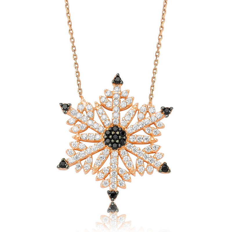 Kadınların ışıltısı, berraklığı kar tanesine benzetilip özel olarak tasarlanmıştır. Kar tanelerinin her birinin bayanlar gibi eşsiz ve ayrı kıymette olması onları özel kılan bir diğer özelliktir. Asilliği her dönemde dikkat çekmeyi başarmıştır. Bunun yanında insanların tıpkı kar taneleri gibi birbirlerine zarar vermeden de mutlu bir şekilde yaşayabileceklerini sembolize etmektedir. Bu şık kolye; doğum günü hediyesi, sevgililer günü hediyesi veya annelere hediye olarak özel günlerde tercih edilebilecek mükemmel bir seçenektir. Kolye, 925 ayar gümüşten imal edilmiştir. Gümüş üzerine rose kaplama yapılmıştır. Rose altın kaplama yapılan gümüş bayan kolye modelleri parlaklığını uzun süre muhafaza eder, gümüşü pembe renge dönüştürür ve oksitlenmesi gecikir. Zincir boyu ortalama 45 cm"dir. Tüm gümüş bayan kolye modellerinde olduğu gibi bu gümüş kar tanesi bayan kolye de tamamı el emeği ile üretilmiştir. Gümüş ve değerli taşlar nedeniyle belirtilen ortalama ürün ağırlığında ± %10 sapma olabilmektedir.