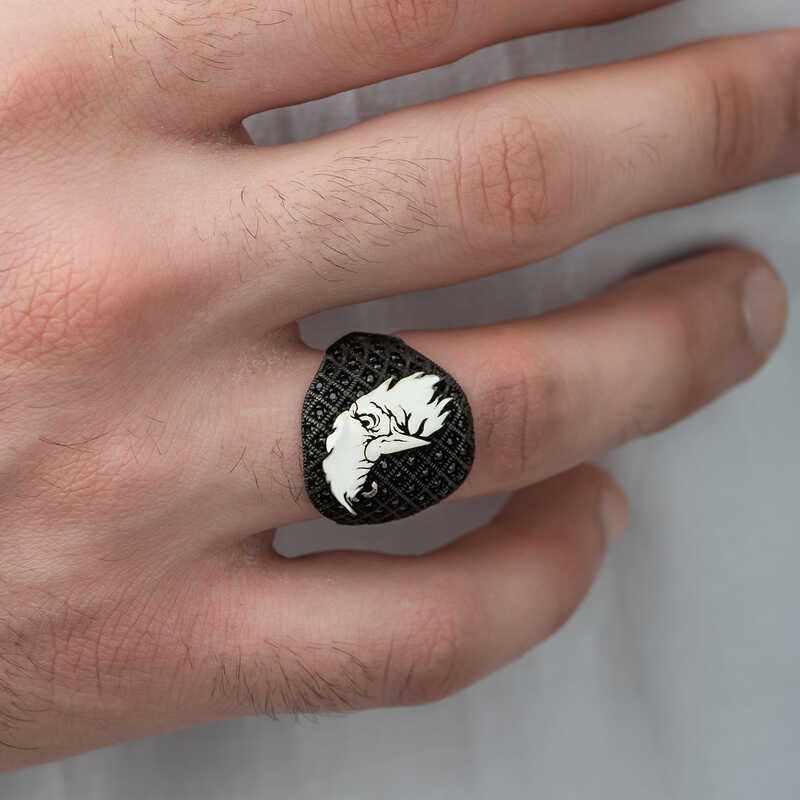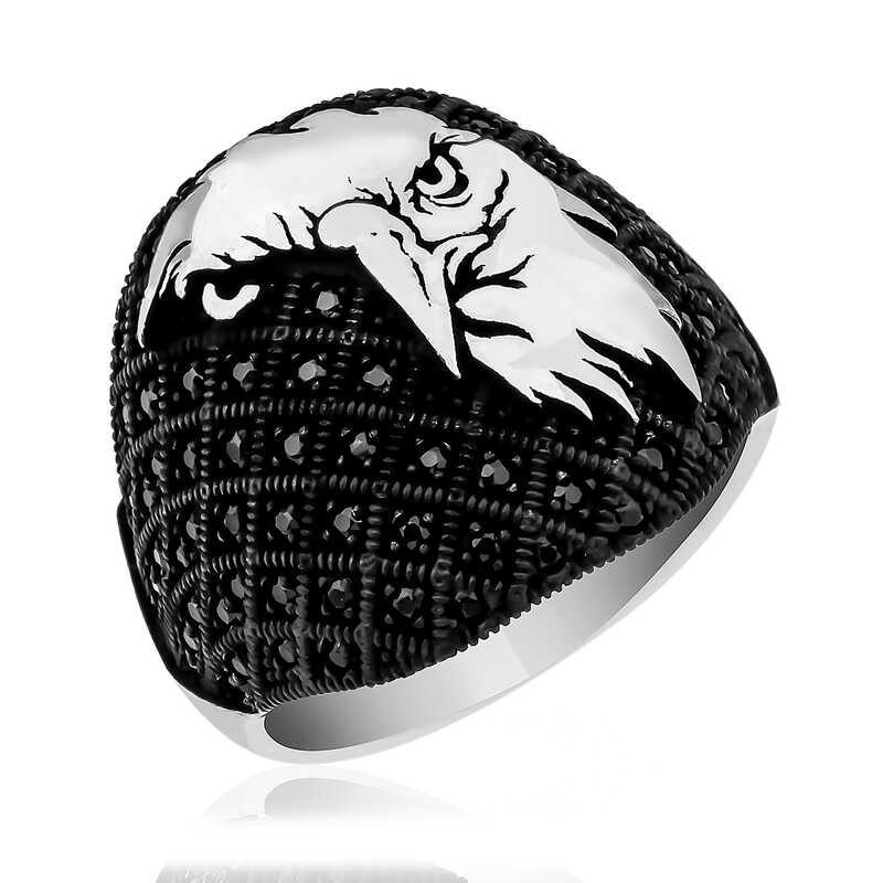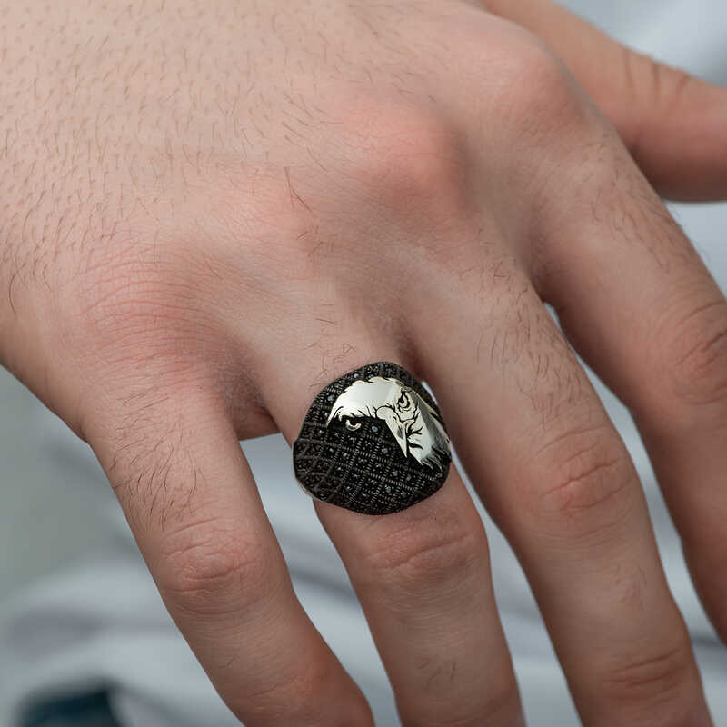 Kuşların kralı olan ve savaşmak üzere dünyaya inen kartal, özellikle savaşçı ve güçlü olmasıyla tanınır; bu yüzden pek çok ulusun sembolü olmuştur. Bu derin anlamdan esinlenerek oluşturulan kartal kafası figürlü erkek yüzüğü; kendinize ya da sevdiklerinize doğum gününde, babalar gününde ve özel günlerde hediye edebilirsiniz. Bu şık erkek yüzük 925 ayar gümüşten imal edilmiştir. Gümüş üzerine oksit kaplama yapılmıştır. Oksit kaplama yapılan yüzükler otantik bir görünüme sahip olur. Tüm erkek yüzüklerde olduğu gibi gümüş kartal kafası erkek yüzük de el emeği ile üretilmiştir. Gümüş ve değerli taşlar nedeniyle ürün ağırlığında ± %10 sapma olabilmektedir.