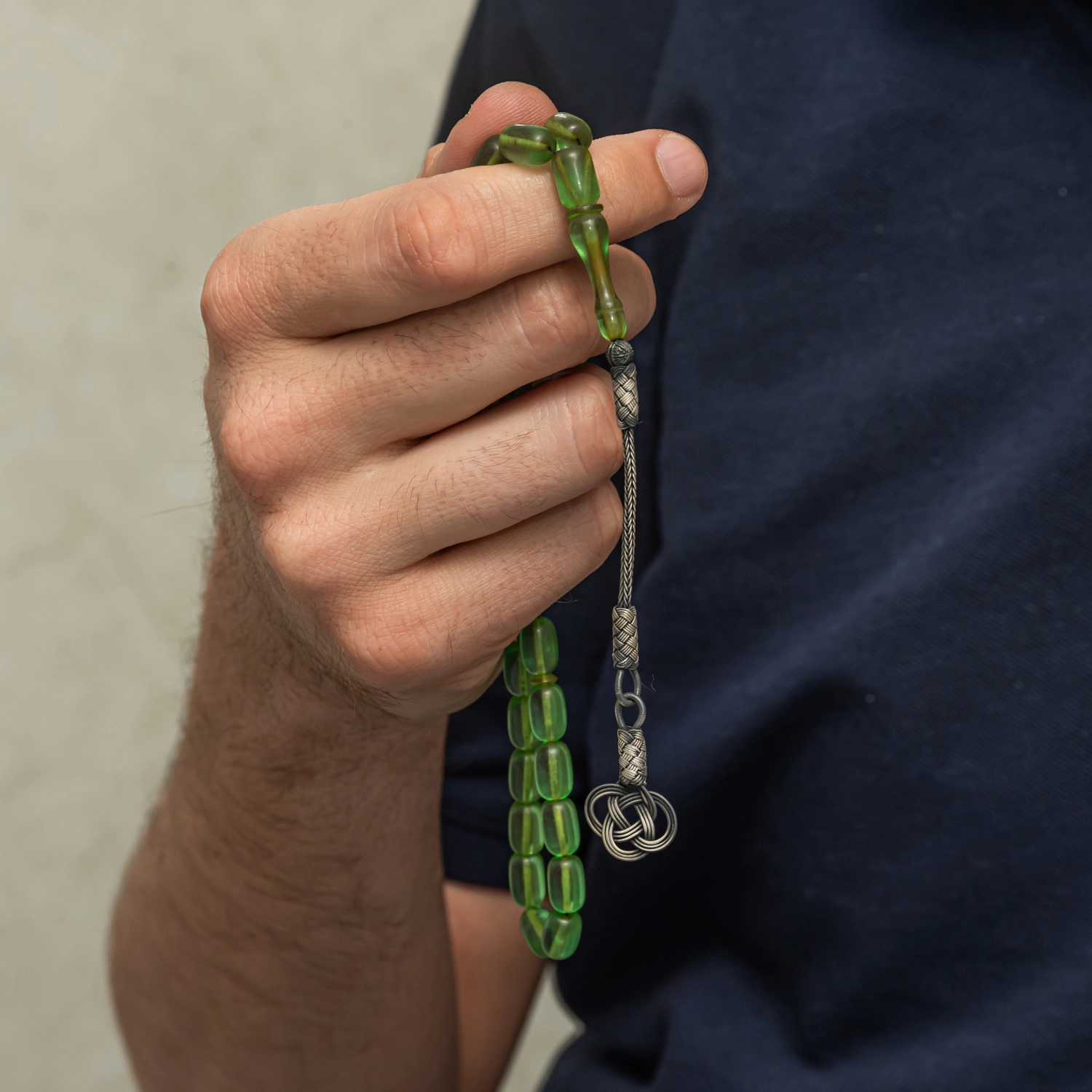 Gümüş Kazaz Püsküllü Kapsül Kesim Yeşil Sıkma Kehribar Tesbih, canlı yeşil rengi ve şık kapsül kesimiyle öne çıkan, gümüş kazaz püskülüyle zarafeti tamamlanmış özel bir tesbihtir.