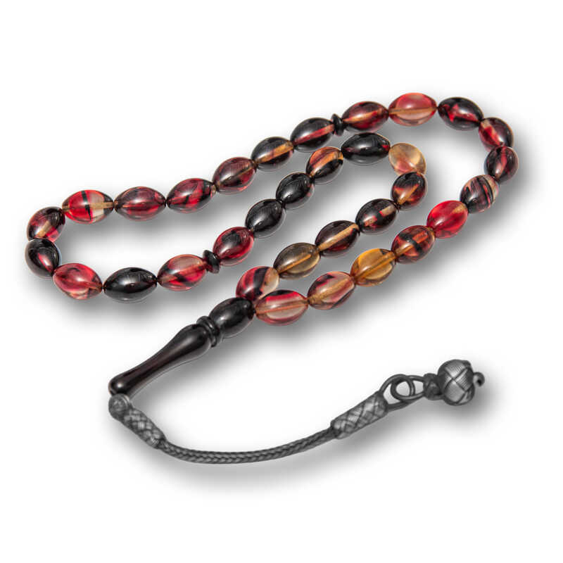 Gümüş Kazaz Püsküllü Sarı Siyah Kırmızı Sıkma Kehribar Tesbih