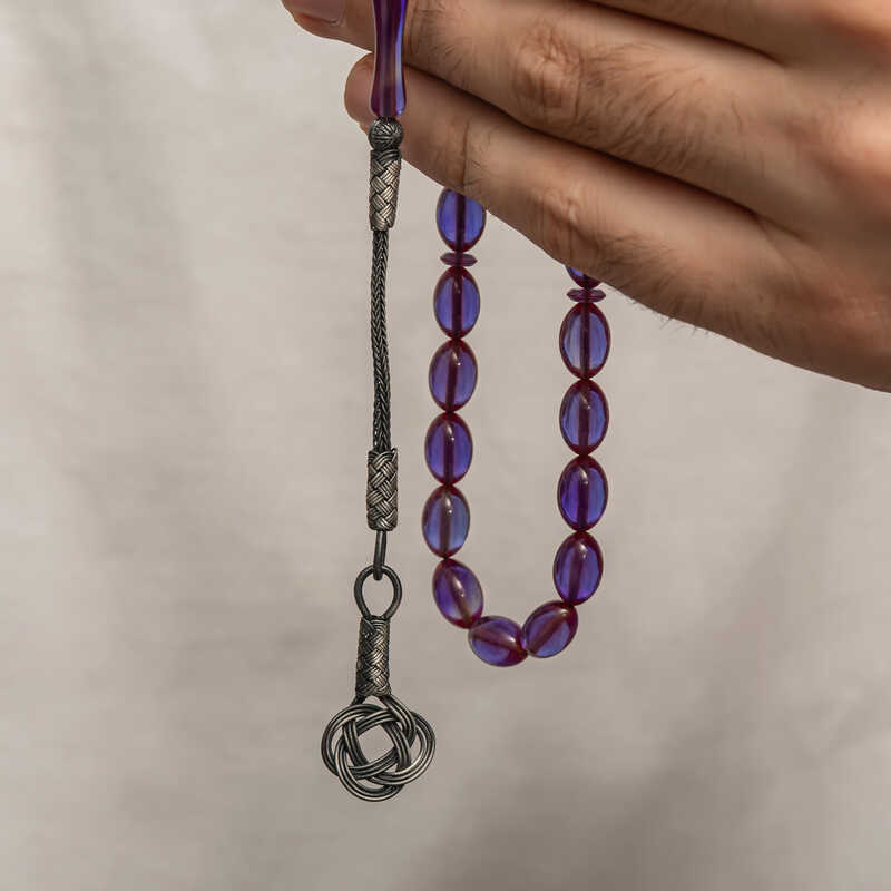Kehribar, çam ağacı reçinesinin toprak altında uzun yıllar boyunca birikerek oluşan bir maddedir. Hemen hemen taş ile aynı sertliktedir fakat yoğunluğu düşüktür. Çam kokusu yayar. Oluşumu uzun zaman aldığından ve yapay olarak yapılamadığından değerli bir maddedir. Sıkma kehribar ise kehribar taşından farklı olarak onun özelliklerini taşıyan, görüntü itibariyle ona benzeyen fakat gerçek olmayan bir malzemedir. Ülkemizde ve dünyanın bir çok yerinde kehribar taşından çeşitli malzemeler üretilmiştir. Ülkemizde en yaygın olarak tesbih üretilmektedir. Kehribar tesbihler elde ısındıkça kehribar benzeri bir koku verir ve renk değiştirir. Bir çok rengi vardır. Hatta iki rengin birleşiminden oluşan kehribar tesbih modelleri de vardır. Genellikle gümüş püskül ile kullanılır veya sistemli olarak da kullanılabilir. Ülkemizin güzide tesbih ustaları bu malzemeyi sıklıkla işlemek suretiyle çeşitli sanat eserleri meydana getirirler. Bu tesbihler de koleksiyonerler tarafından alınıp satılmaktadır. Gümüş 1000 ayar kazaz püsküllü sıkma kehribar tesbih modeli de günlük hayatta kullanılabilecek çok şık bir tesbih çeşididir. Özel günlerin vazgeçilmez hediyesi sıkma kehribar tesbihler erkekler için doğum günü, sevgililer günü ve babalar günü gibi özel zamanlarda hediye olarak tercih edilebilir. Gümüş kazaz püsküllü sıkma kehribar tesbih modeli diğer kehribar tesbih modellerinde olduğu gibi tamamen el emeği ile imal edilmiştir.