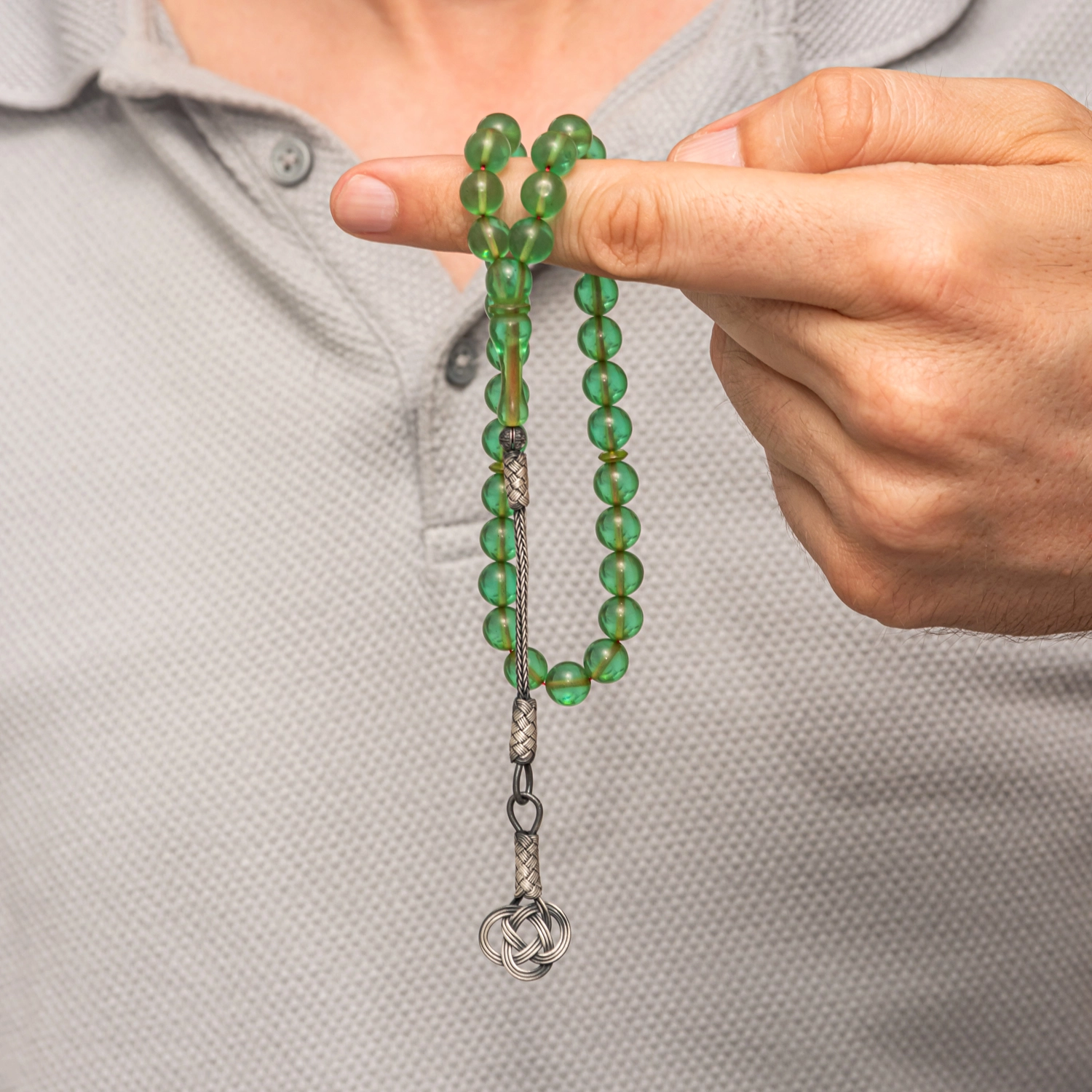 Gümüş Kazaz Püsküllü Yeşil Sıkma Kehribar Tesbih, canlı yeşil tonlara sahip sıkma kehribar taneleri ve el işçiliği 925 ayar gümüş kazaz püskülüyle, şıklık ve geleneksel zarafeti bir arada sunar.