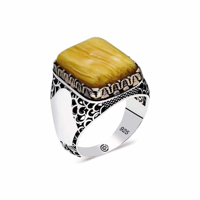 Gümüş Koyu Sarı Sıkma Kehribar Taşlı Kare Erkek Yüzük
