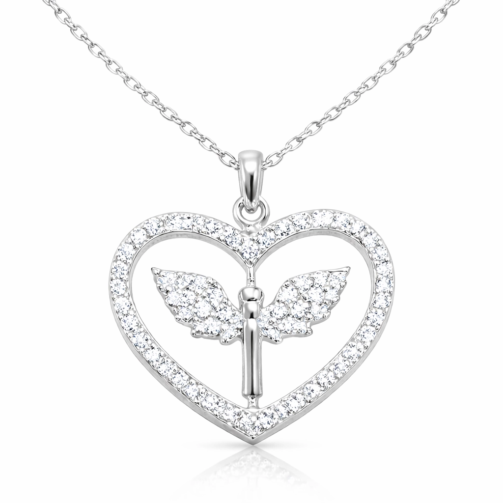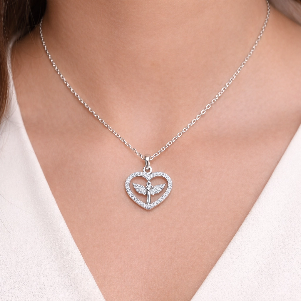 Zirkon taşlarla süslenmiş kalp formu içinde Mikail Meleği figürü bulunan, şık ve anlamlı 925 ayar gümüş kadın kolye.