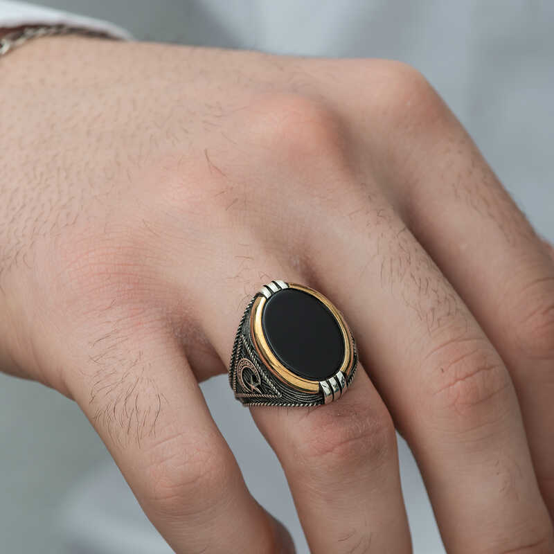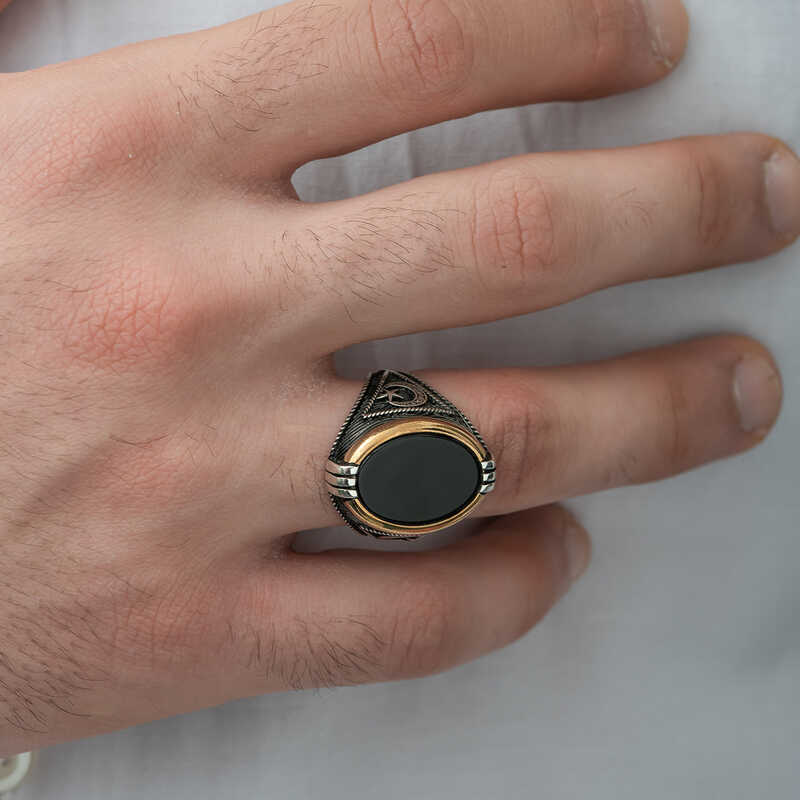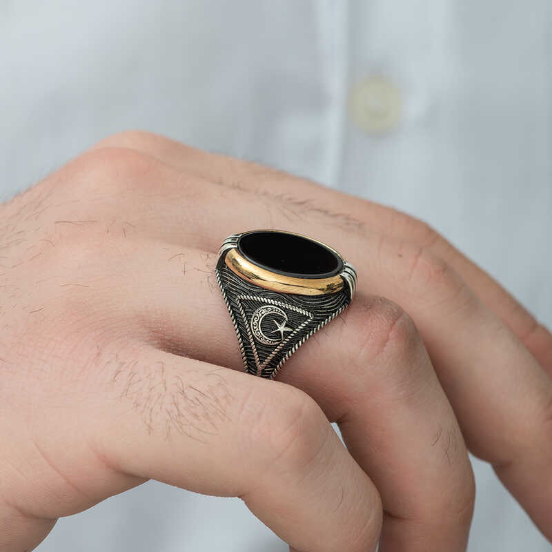 Milyonlarca yıl içerisinde yeryüzüne ulaşan oniks taşı, kayaçların ve bazı bileşenlerin ısınma ve soğumasıyla zaman içerisinde bir araya gelmesi üzerinden oluşmuş bir taştır. Oniks taşı şans taşı olarak bilinmekte olup yarı değerli bir taş türüdür. Oniks, işlenebilir olması ve estetik olarak şık durması sebebiyle eski çağlardan günümüze dek çeşitli süs eşyaları ve takıların yapımında kullanılmıştır. Oniks taşı toprak grubu burçları olan Boğa, Başak ve Oğlak’ın kutsal taşıdır. Bu burca sahip kişiler oniks taşlı aksesuarları tercih ederek negatif enerjiden korunabilirler. Yüzüğün yanlarında bulunan ay yıldız motifi "Bir görüşe göre, Türk Bayrağı"ndaki hilal "İslamiyeti" yıldız ise "Türklüğü"; başka bir görüşe göre yıldız "demokrasi" eşitlik ve özgürlüğü, hilal "İslam"ı simgelemektedir. Bu şık yüzüğü; kendinize ya da sevdiklerinize doğum gününde, babalar gününde ve özel günlerde tercih edebilirsiniz. Bu şık yüzük 925 ayar gümüşten imal edilmiştir. Gümüş üzerine oksit kaplama yapılmıştır. Oksit kaplama yapılan yüzükler otantik bir görünüme kavuşur. Tüm erkek yüzüklerde olduğu gibi gümüş oniks taşlı ay yıldız armalı erkek yüzük modeli de el emeği ile üretilmiştir. Gümüş ve değerli taşlar nedeniyle belirtilen ortalama ürün ağırlığında ± %10 sapma olabilmektedir.