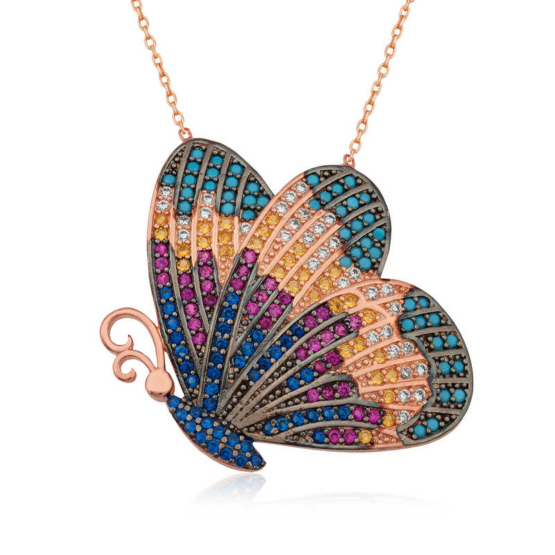 Özgürlüğü masumiyeti ve saflığı simgeleyen kelebekler, tertemiz sevginin ve aşkın ifadesidir. Sizin olduğu kadar sevdiklerinizin de keyifle takacağı renkli kelebek bayan kolye en güzel hediyelerden biri olacaktır. Kolye 925 ayar gümüşten imal edilmiştir. Gümüş üzerine rose altın kaplama yapılmıştır. Rose altın kaplama yapılan gümüş bayan kolyeler parlaklığını uzun süre muhafaza eder, gümüşü pembe renge dönüştürür ve oksitlenmeyi geciktirir. Gümüş olan zincir boyu ortalama 45 cm"dir. Tüm gümüş bayan kolyelerde olduğu gibi gümüş renkli kelebek bayan kolye de el emeği ile üretilmiştir. Gümüş ve değerli taşlar nedeniyle belirtilen ürün ağırlığında ± %10 sapma olabilmektedir.