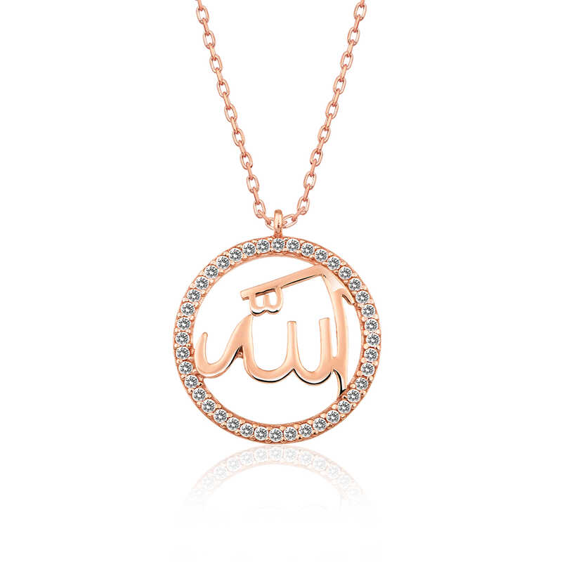 Din, manevi bir tarafı olan inanca dayalı bir sistemdir.  Allah, bütün kâinatın ve canlı cansız bütün varlıkların mutlak ve tek yaratıcısıdır. Bu düşüncelere sahip inançlı insanların üzerinde taşımak isteyebilecekleri, günlük hayatta yanlarından ayırmayacakları özel bir aksesuardır. Bu şık kolye modeli manevi duyguları ifade etmenin anlamlı bir yolu olacaktır. Şık bir tasarıma sahip bu kolye size ve sevdiklerinize huzur verecek. Üzerinde arapça Allah yazılı bayan kolye 925 ayar gümüşten imal edilmiştir. Gümüş üzerine rose kaplama yapılmıştır. Rose kaplama yapılan gümüş bayan kolye modelleri parlaklığını uzun süre muhafaza eder ve oksitlenmesi gecikir. Kolye üzerinde bulunan taşlar zirkondur. Gümüş olan zincir boyu ortalama 45 cm’dir. Tüm gümüş bayan kolye modellerinde olduğu gibi gümüş rose arapça Allah yazılı bayan kolye modeli de el emeği ile üretilmiştir. Gümüş ve değerli taşlar nedeniyle belirtilen ürün ağırlığında ± %10 sapma olabilmektedir.